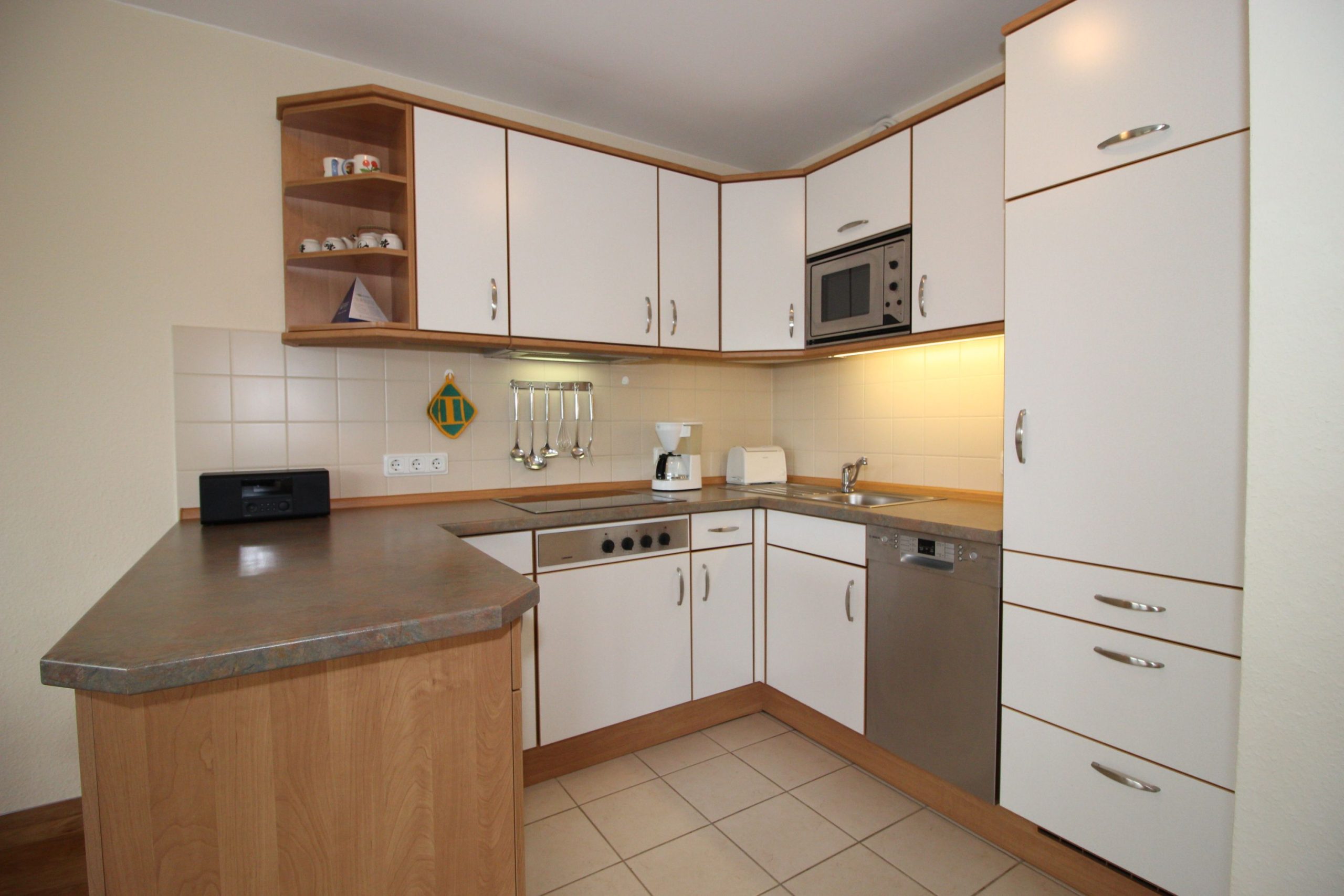 Die Küchenzeile ist mit einer Mikrowelle, einem Geschirrspüler und weiteren Küchenutensilien ausgestattet.Badezimmer