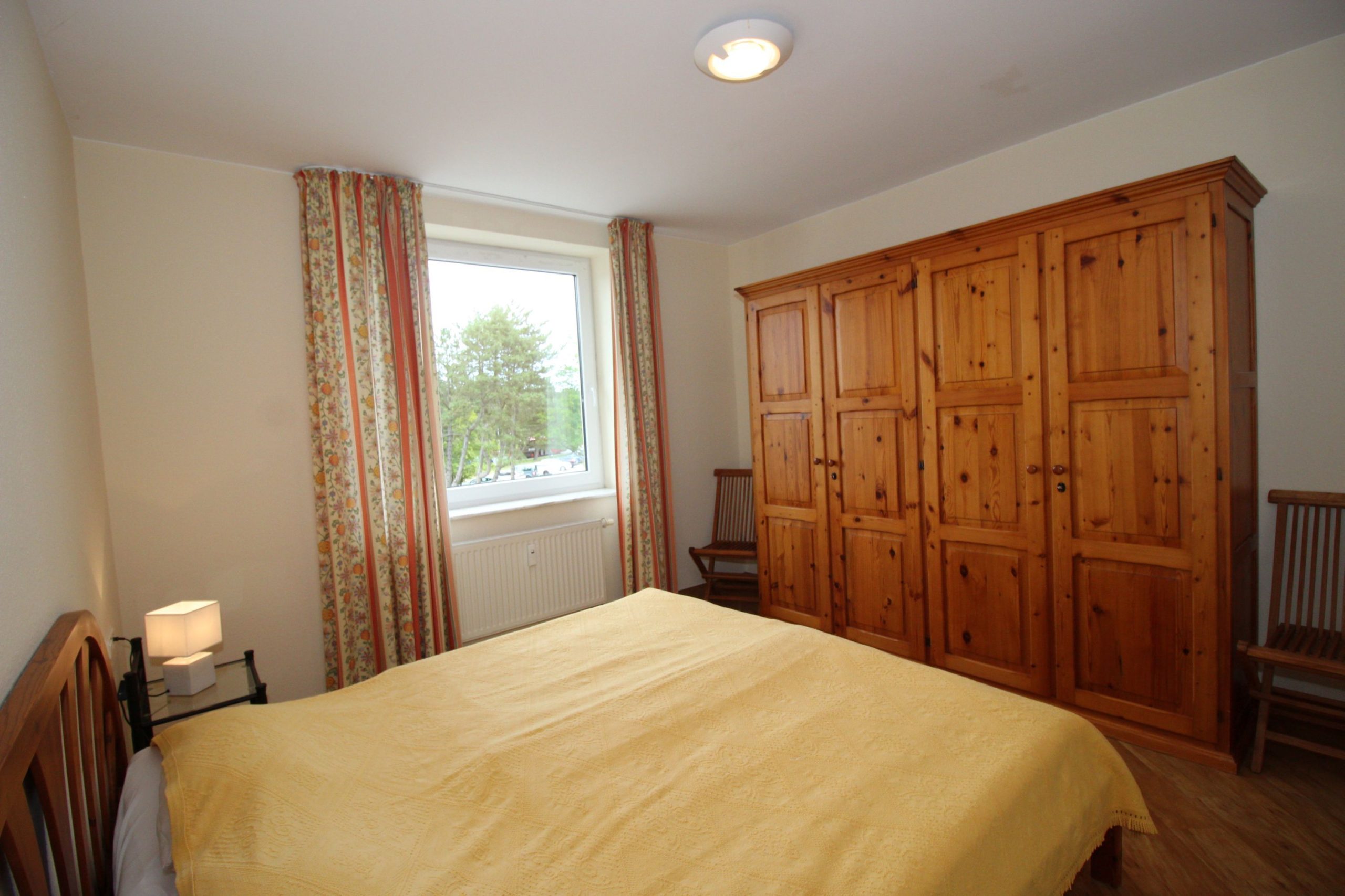 Der lichtdurchflutete Wohnbereich ist mit einem weinroten Sofa und zwei gemütlichen Korbsesseln bestückt. Ein flauschiger Teppich sorgt für warme Füße. Für mediale Unterhaltung sorgt ein TV.Schlafzimmer