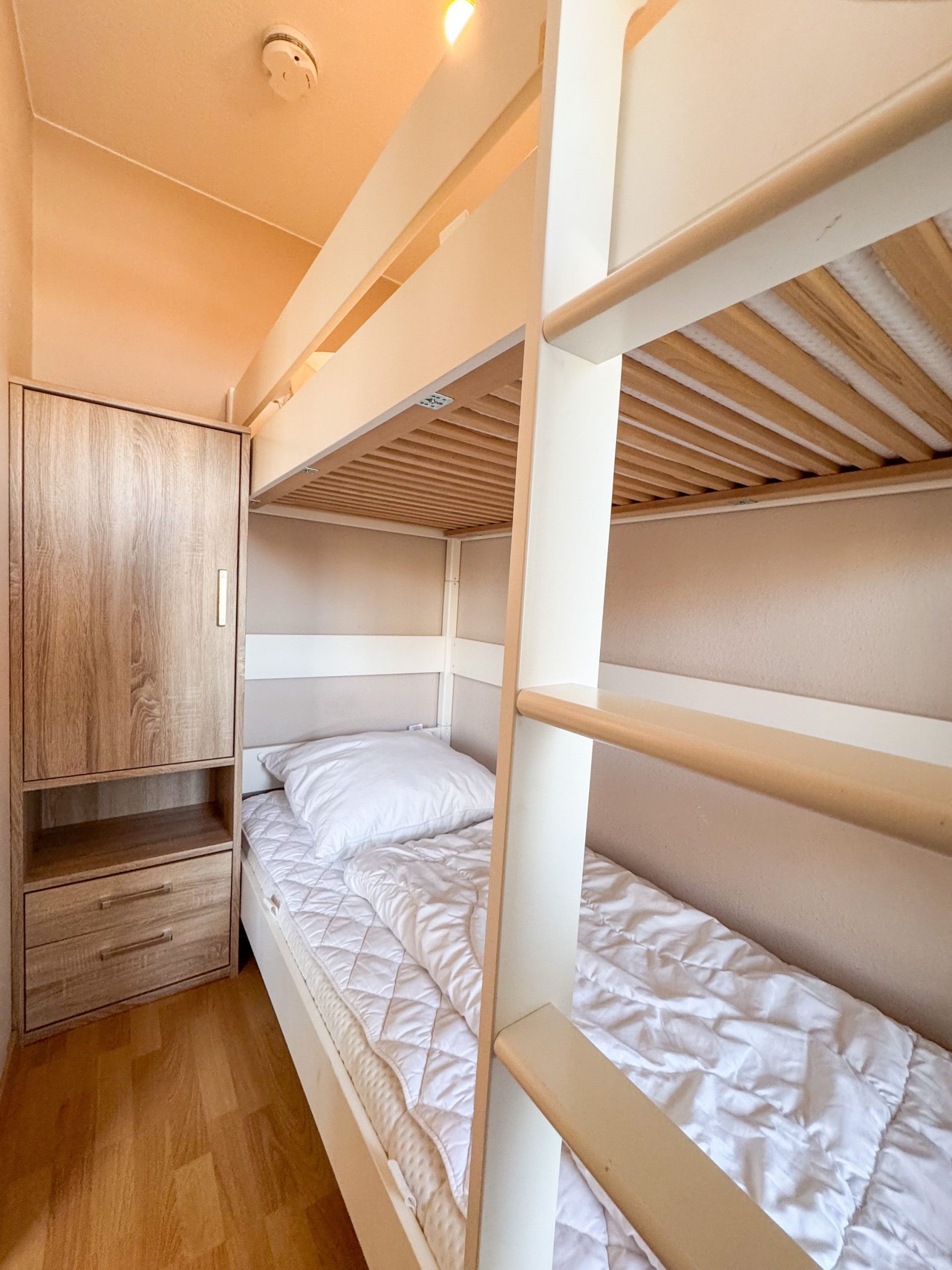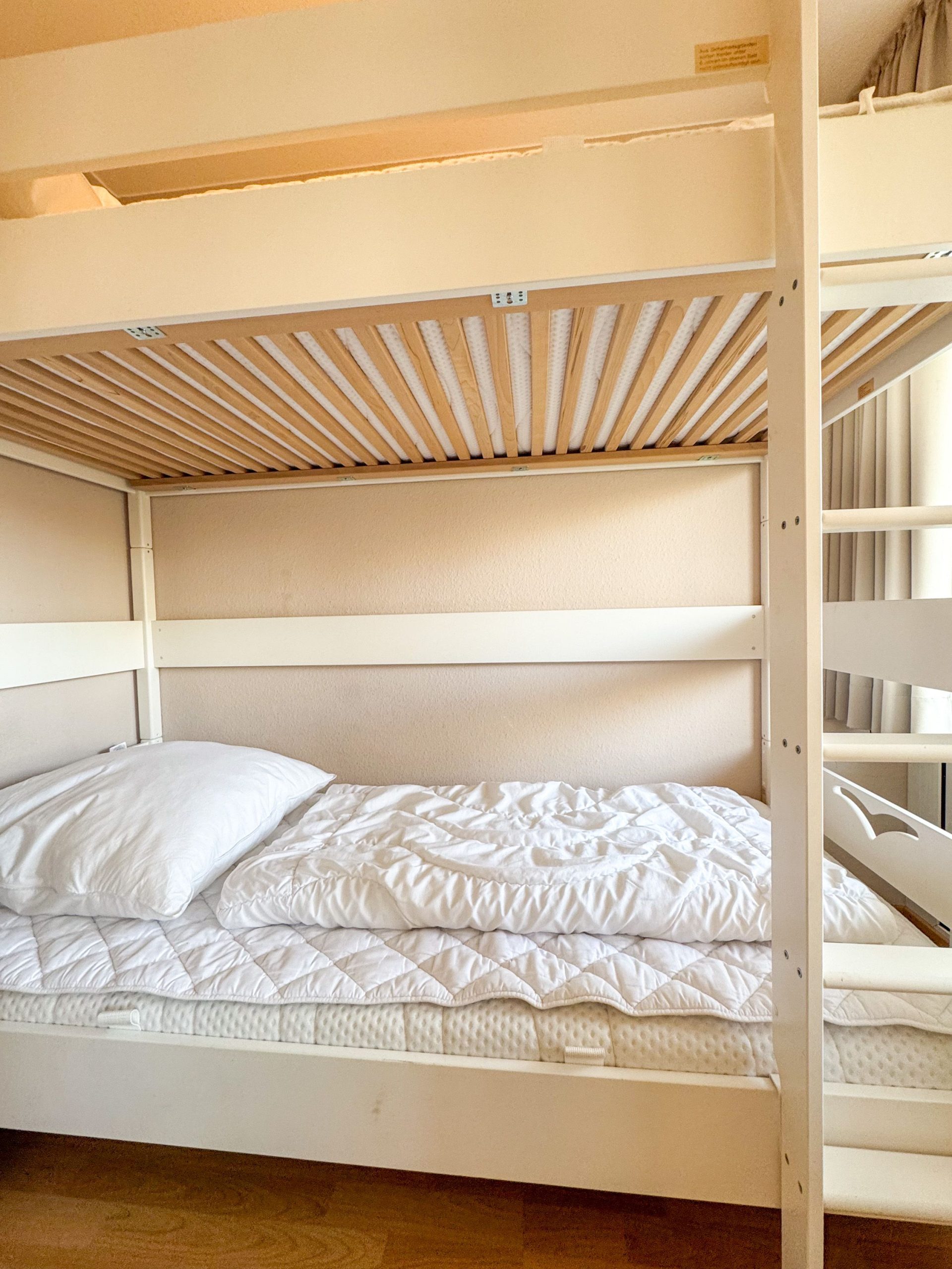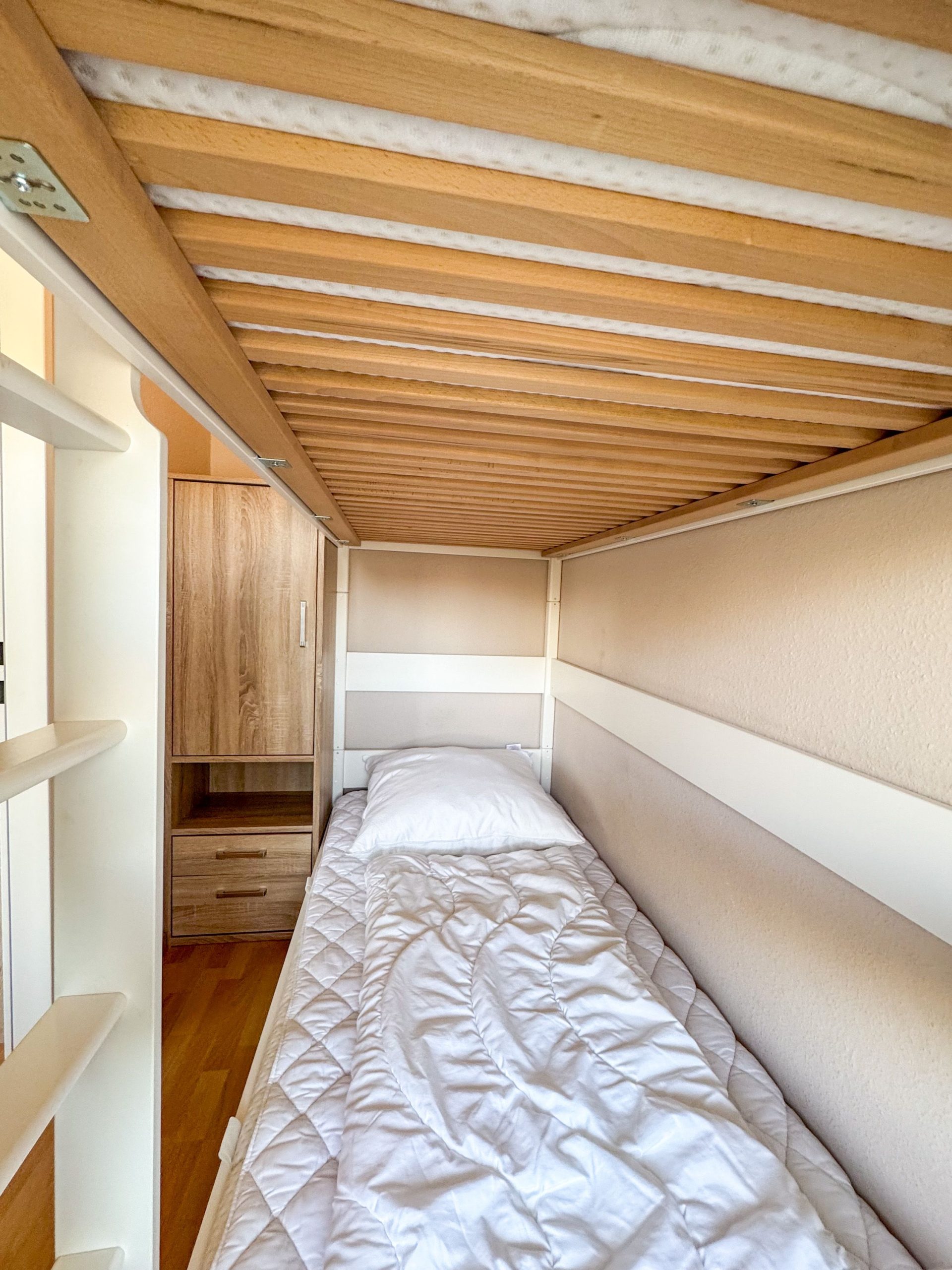 Die freundlich eingerichtete Ferienwohnung verfügt über ein Schrankbett, das sich im Wohnbereich befindet. In einem separaten, kleinen Zimmer befindet sich ein Etagenbett. Hier können bis zu zwei kleine Cuxhaven-Urlauber ruhen und träumen.Küche