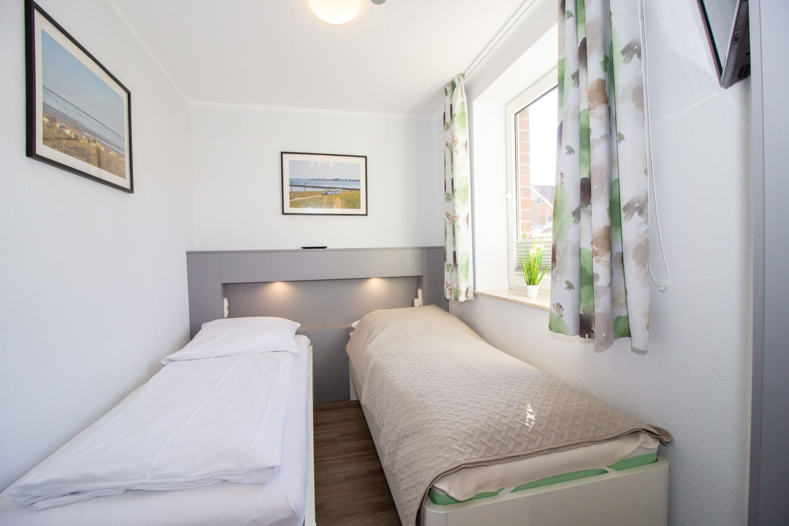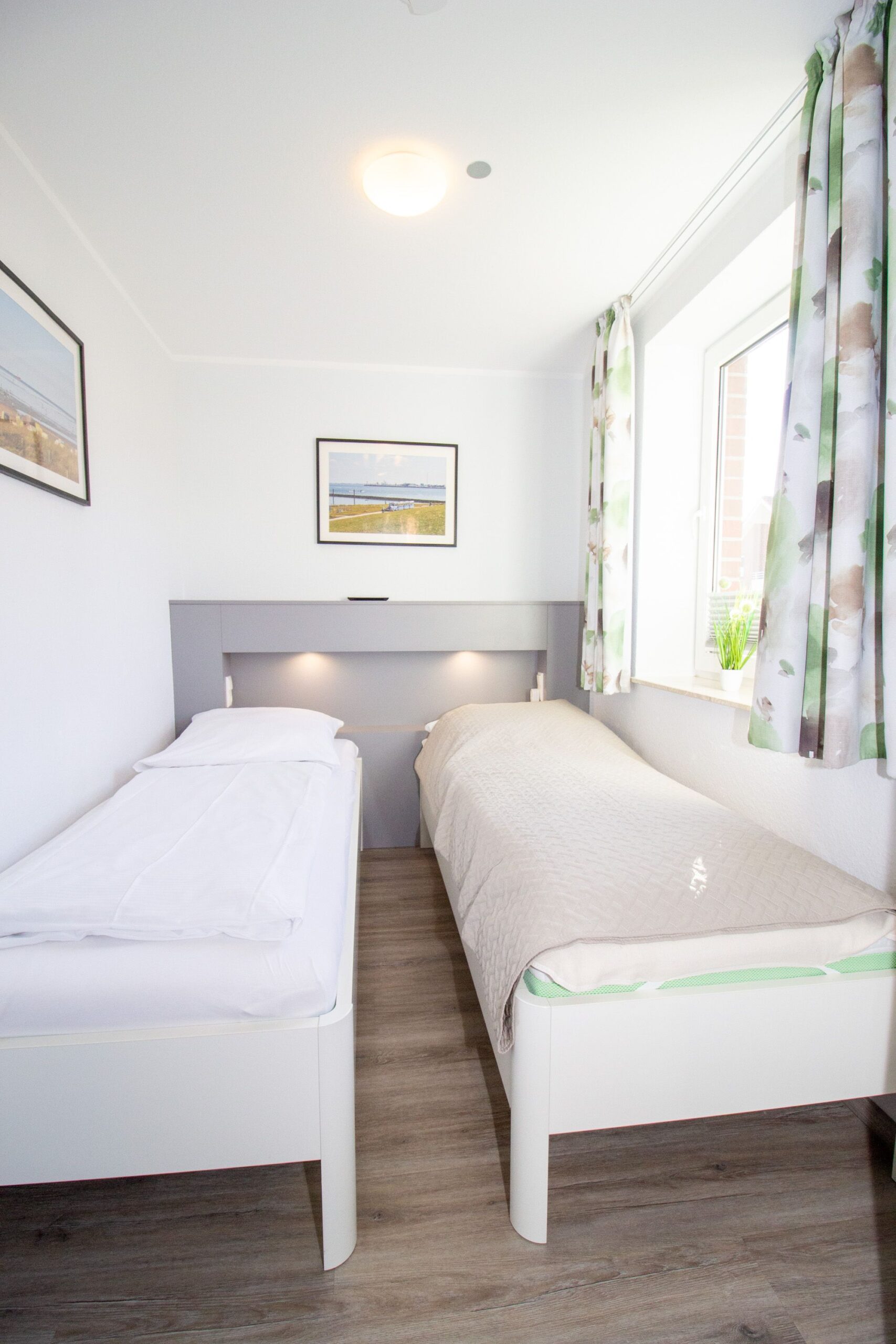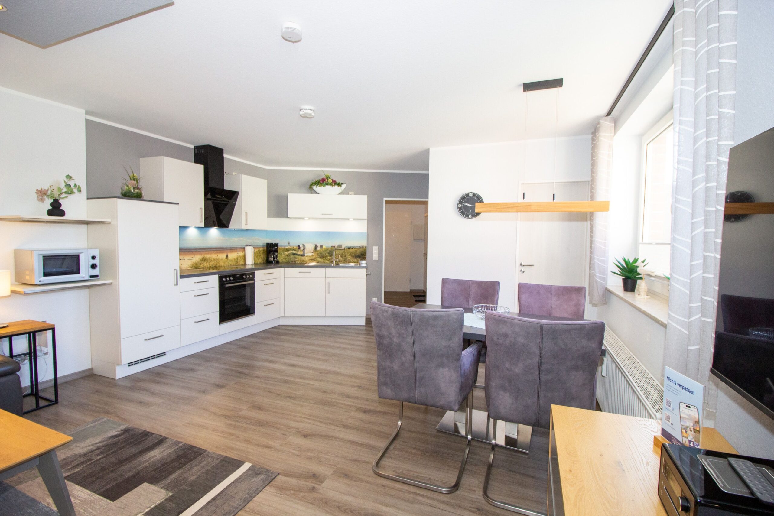 Die Ferienwohnung in Cuxhaven verfügt über zwei Schlafzimmer. Das großzügige, hell eingerichtete Schlafzimmer 1 ist mit einem Boxspringbett (elektrisch verstellbare Lattenroste) Größe 180 x 200 cm ausgestattet. Es verfügt über zwei getrennte Matratzen mit integrierten Toppern. Die motorisch verstellbaren Lattenroste ermöglichen es jedem Gast die für ihn optimale Schlafposition einzustellen um gut erholt in den neuen Tag zu starten. Ein weiteres TV-Gerät ist ebenfalls vorhanden. Das abgebildete Kinderbett ist ein Vorschlag zur Stellmöglichkeit und kann gegen Gebühr dazu gebucht werden. Ebenso auch ein Kinder-Hochstuhl. In Schlafzimmer 2 befinden sich zwei Einzelbetten (Größe je 80 x 200 cm), die bei Bedarf auch zusammen geschoben werden können und ein weiteres 3. TV-Gerät.Küche