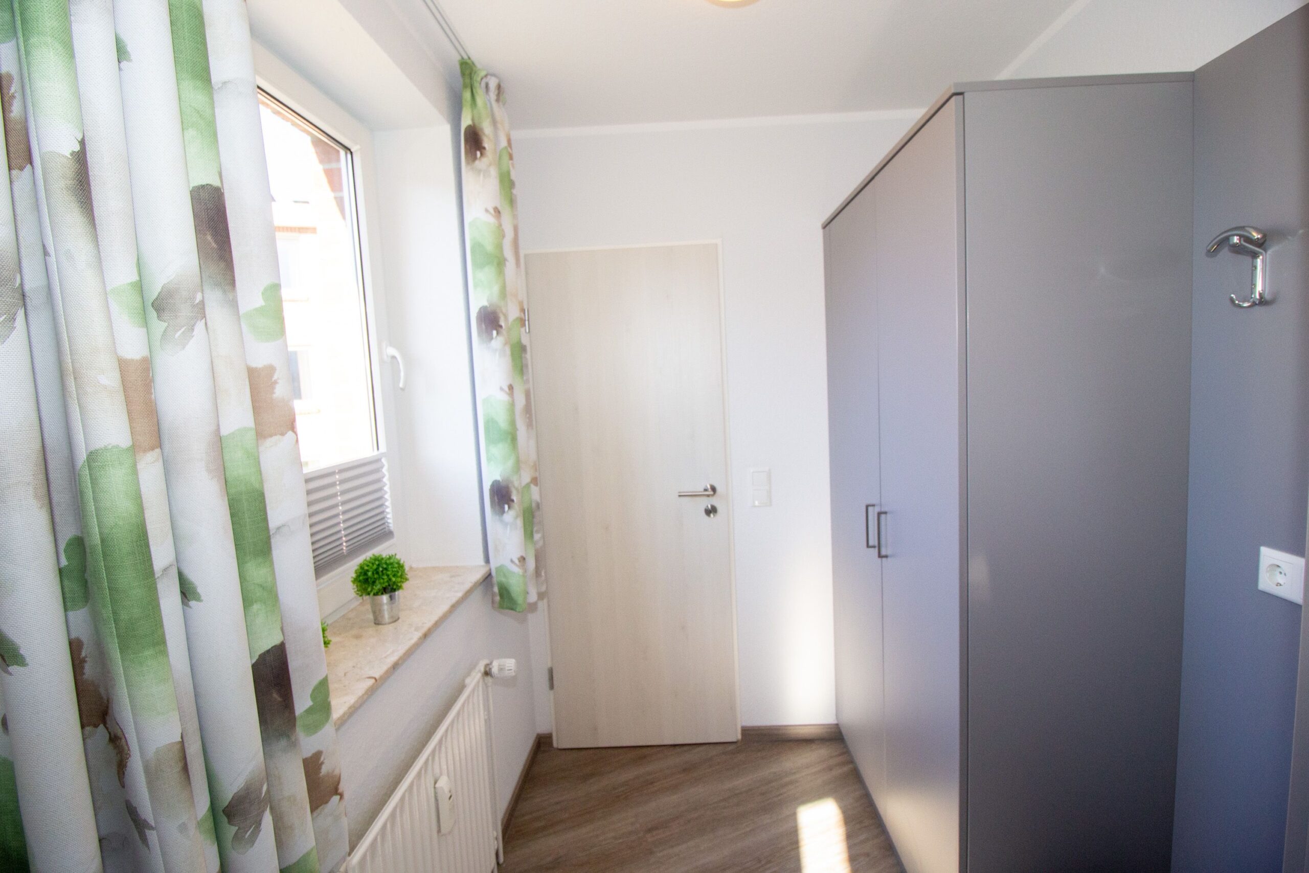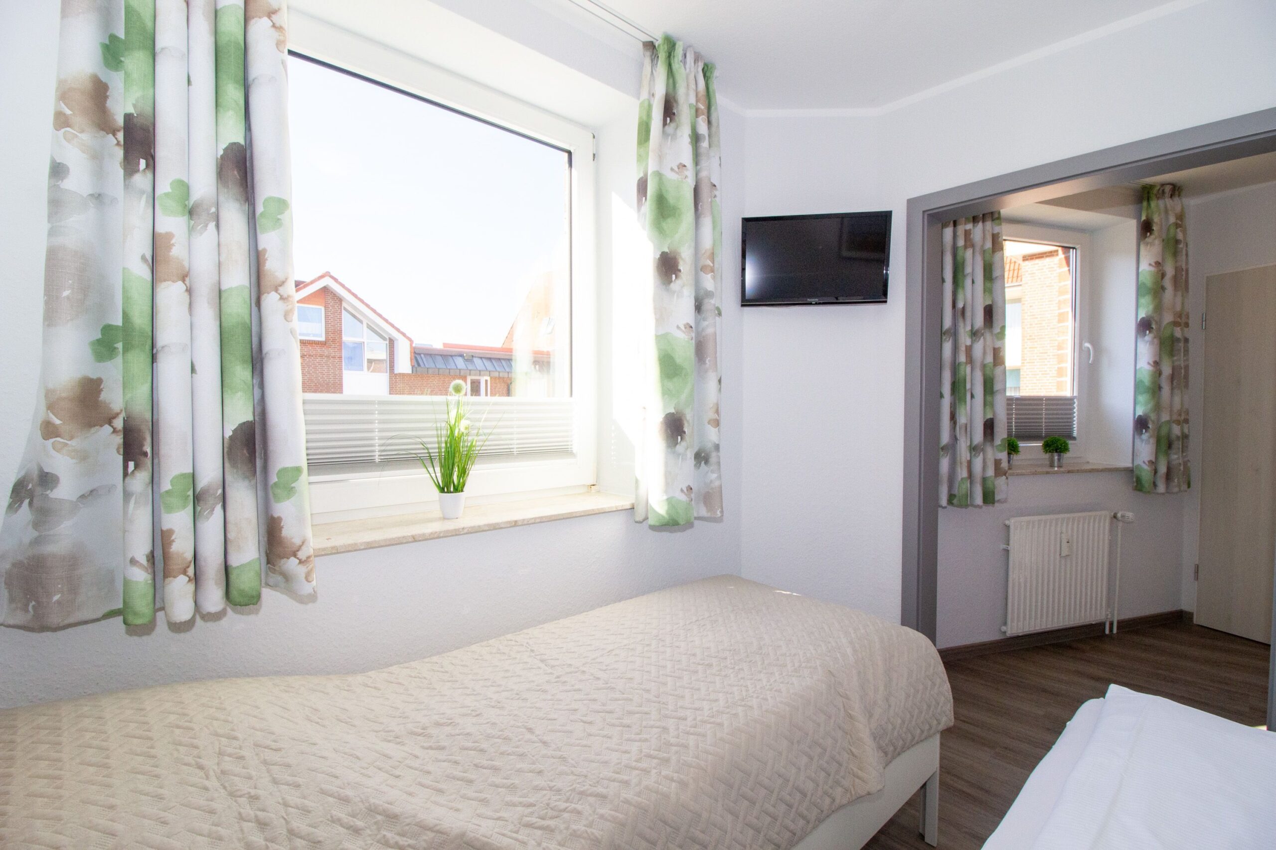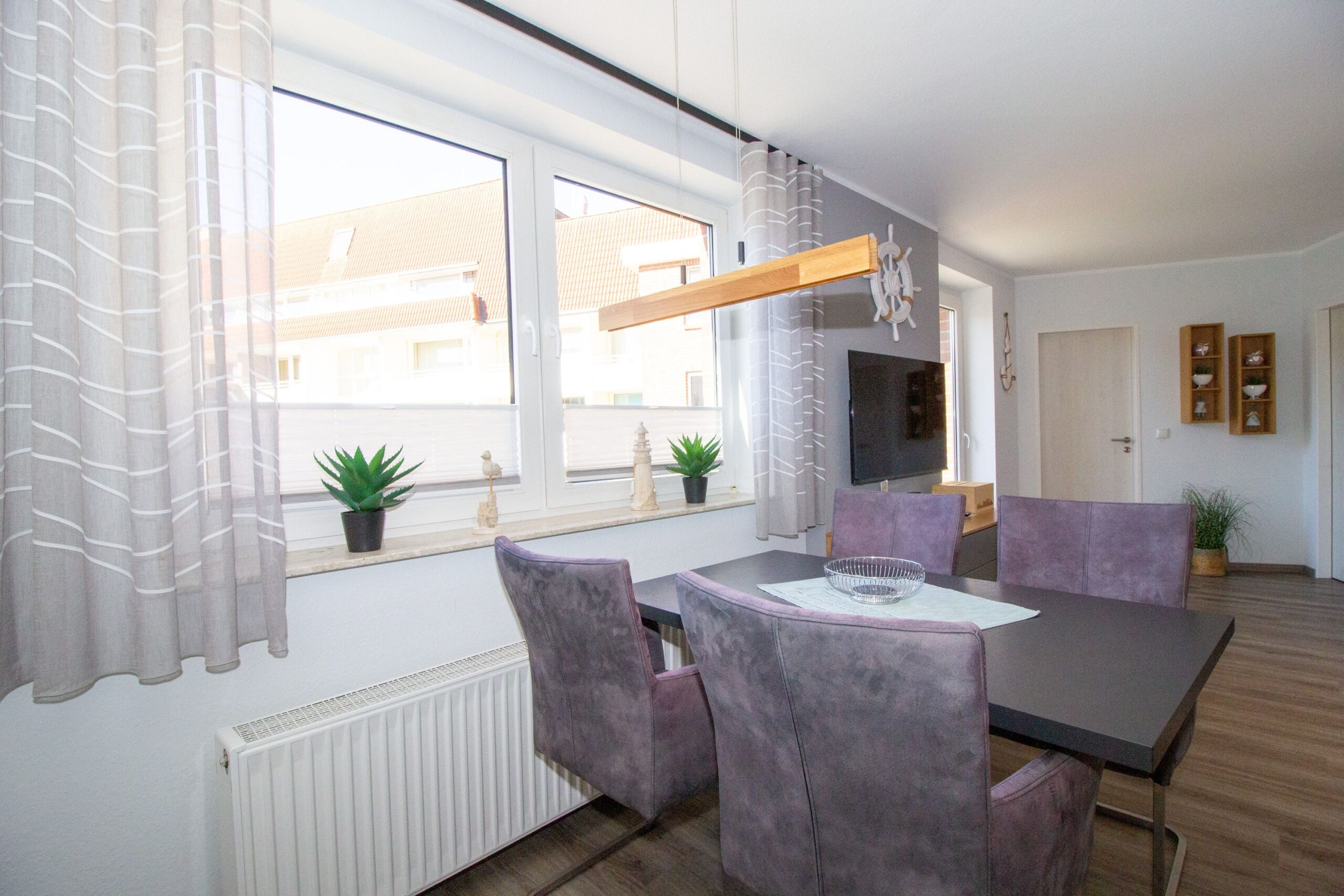 Die Ferienwohnung in Cuxhaven verfügt über zwei Schlafzimmer. Das großzügige, hell eingerichtete Schlafzimmer 1 ist mit einem Boxspringbett (elektrisch verstellbare Lattenroste) Größe 180 x 200 cm ausgestattet. Es verfügt über zwei getrennte Matratzen mit integrierten Toppern. Die motorisch verstellbaren Lattenroste ermöglichen es jedem Gast die für ihn optimale Schlafposition einzustellen um gut erholt in den neuen Tag zu starten. Ein weiteres TV-Gerät ist ebenfalls vorhanden. Das abgebildete Kinderbett ist ein Vorschlag zur Stellmöglichkeit und kann gegen Gebühr dazu gebucht werden. Ebenso auch ein Kinder-Hochstuhl. In Schlafzimmer 2 befinden sich zwei Einzelbetten (Größe je 80 x 200 cm), die bei Bedarf auch zusammen geschoben werden können und ein weiteres 3. TV-Gerät.Küche