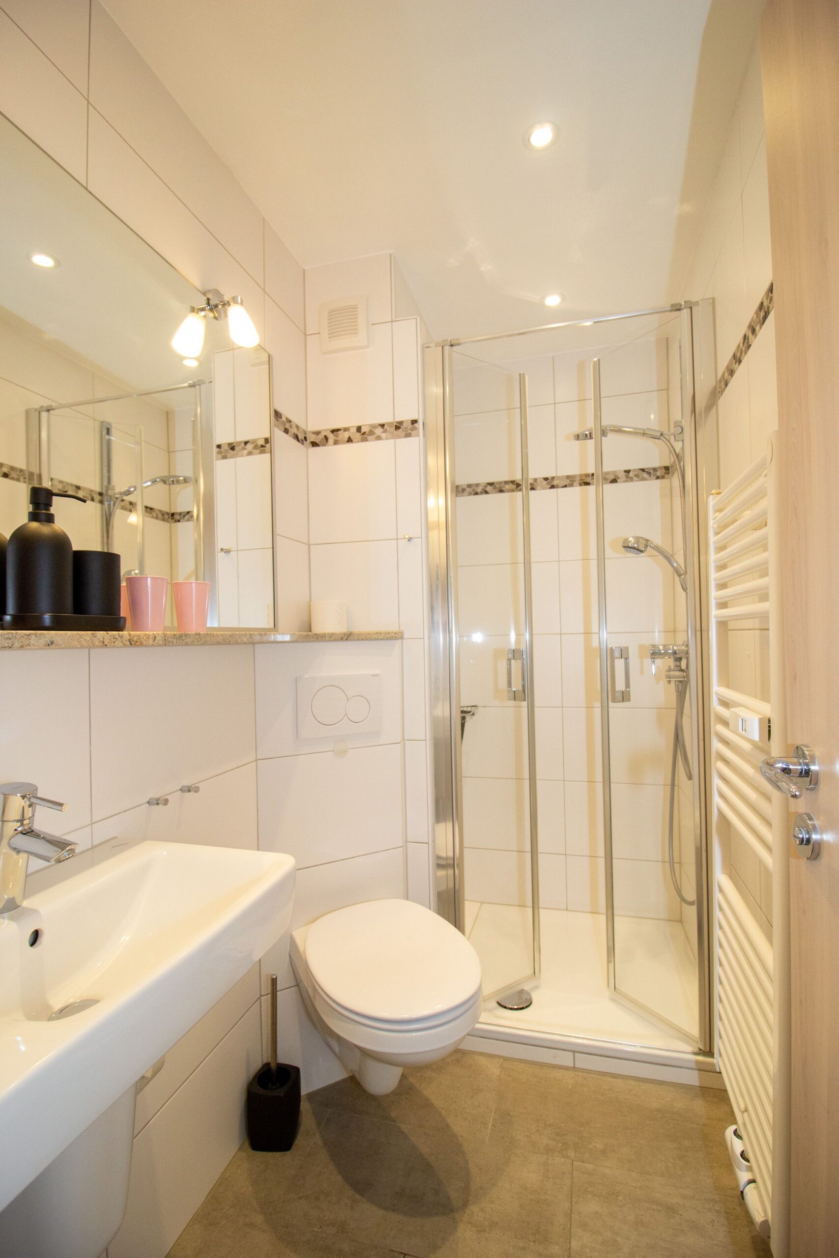 Das modern und hell gestaltete Badezimmer ist ausgestattet mit einem großen Spiegel, der den Raum optisch vergrößert. Der niedrige Einstieg in die Dusche bietet Ihnen einen leichten Zutritt.Allgemein