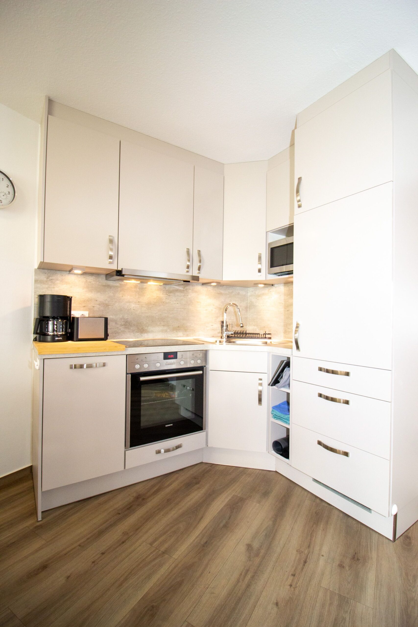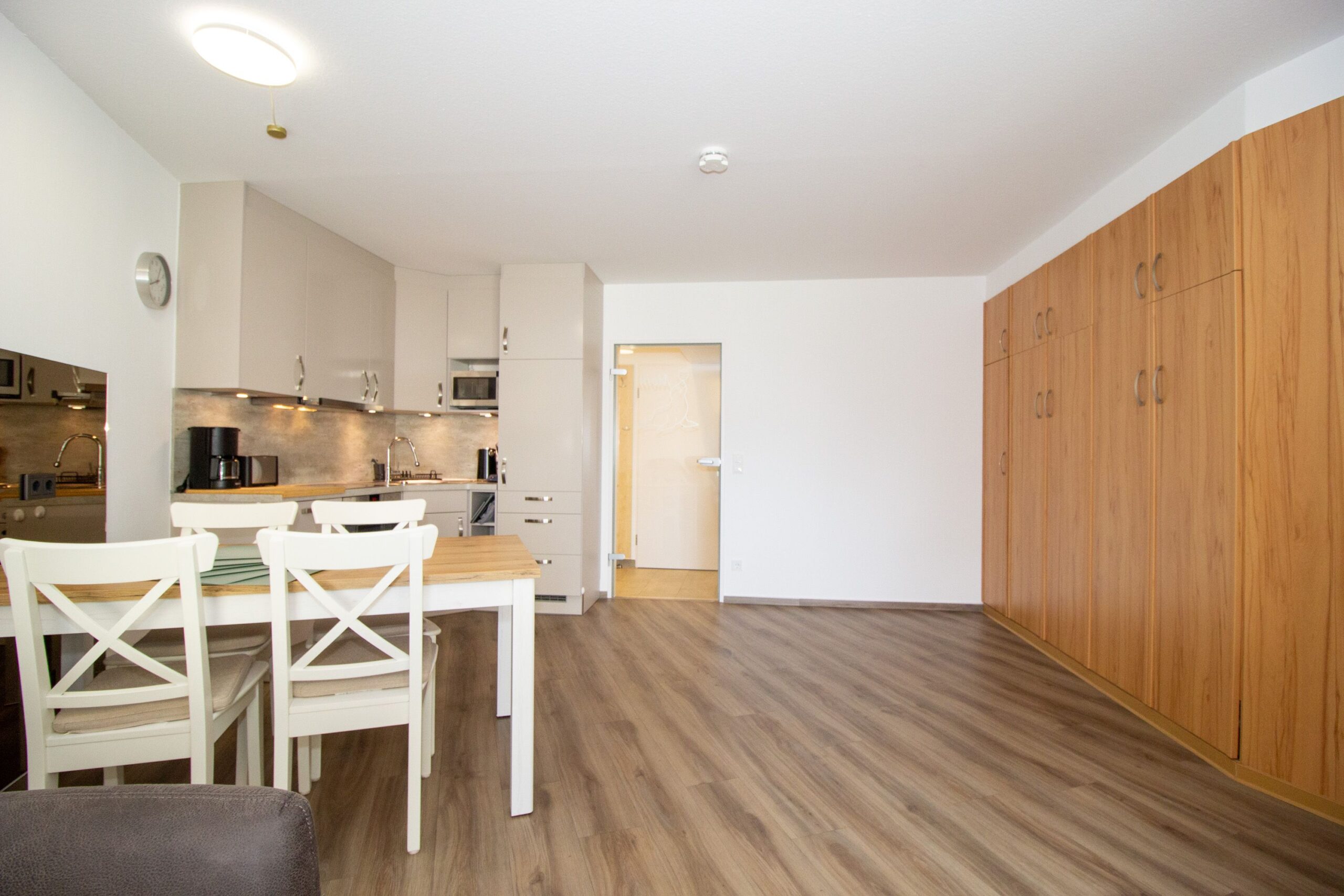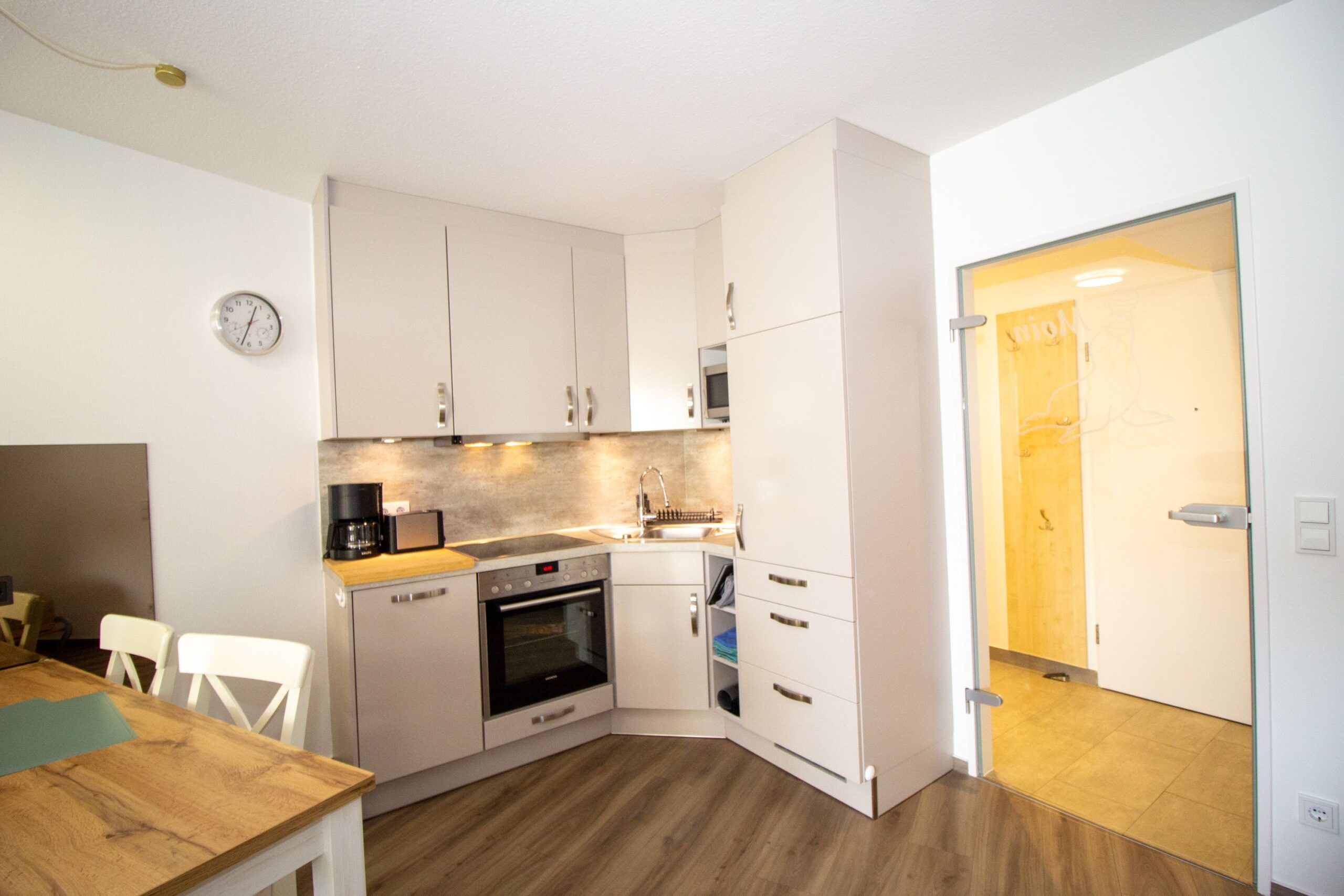 Die Ferienwohnung verfügt über einen Wohn/Schlafraum, ein kleines separates Schlafzimmer sowie ein Badezimmer mit Dusche. Die offene Küche ist modern ausgestattet und grenzt direkt an das Wohnzimmer an. Zur Ausstattung gehören ein 4-Platten-Ceranfeld, Backofen, Mikrowelle, Kühlschrank, Toaster, Wasserkocher, Kaffeemaschine sowie komplettes Geschirr und Besteck. Dies ermöglicht eine flexible Selbstversorgung während Ihres Aufenthalts. Des Weiteren steht eine Spülmaschine zur Verfügung, welche den Abwasch erleichtert.