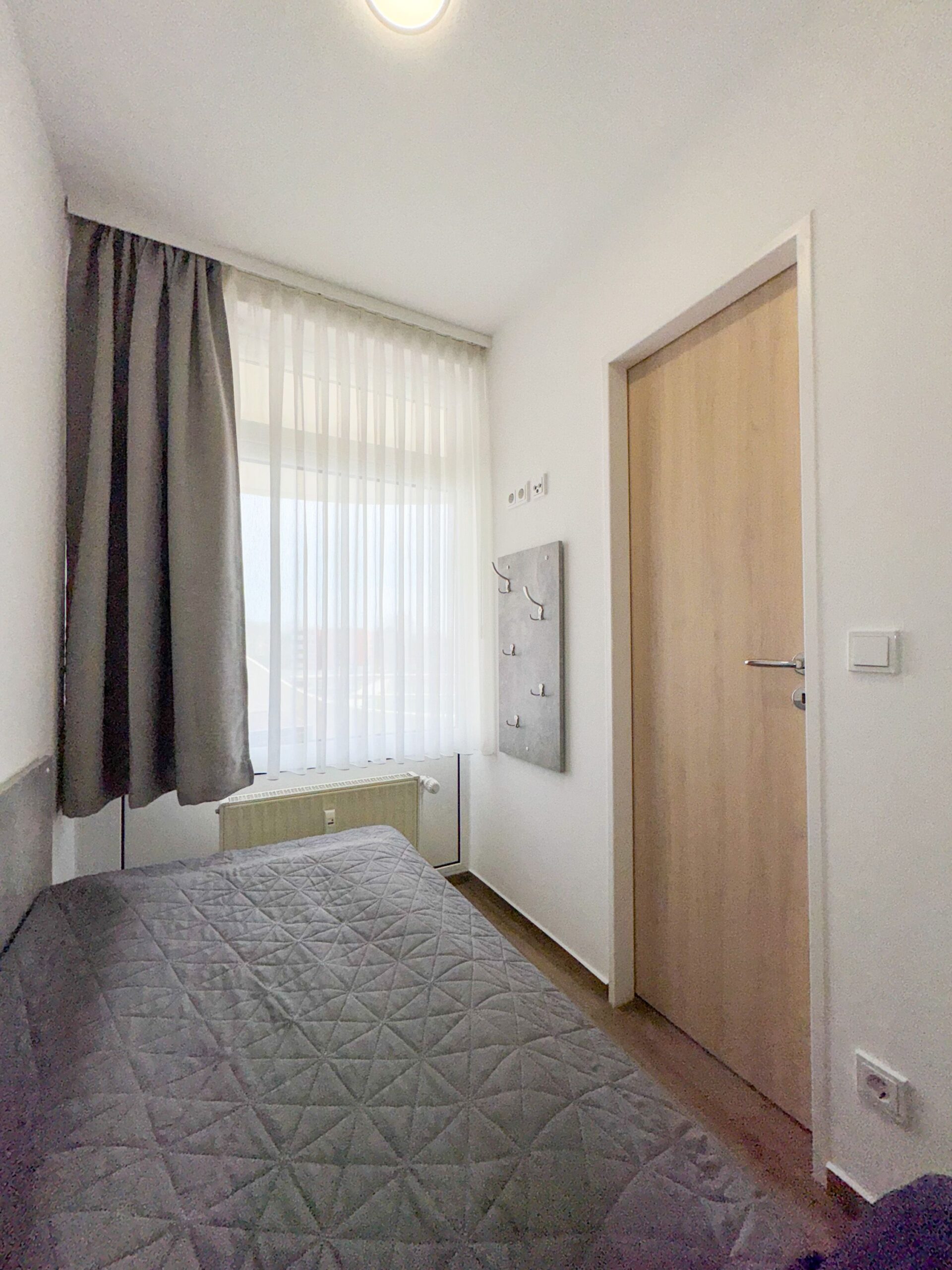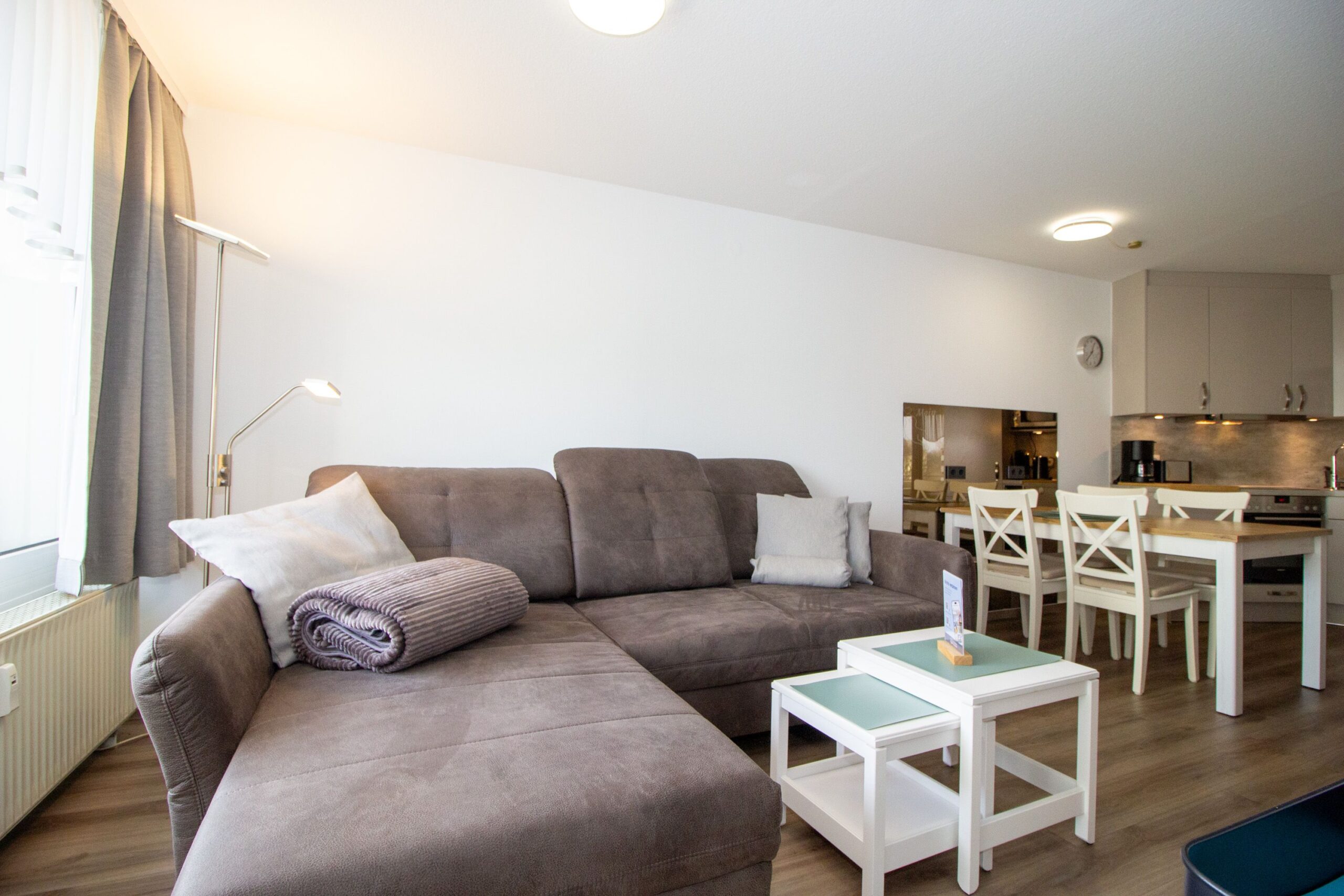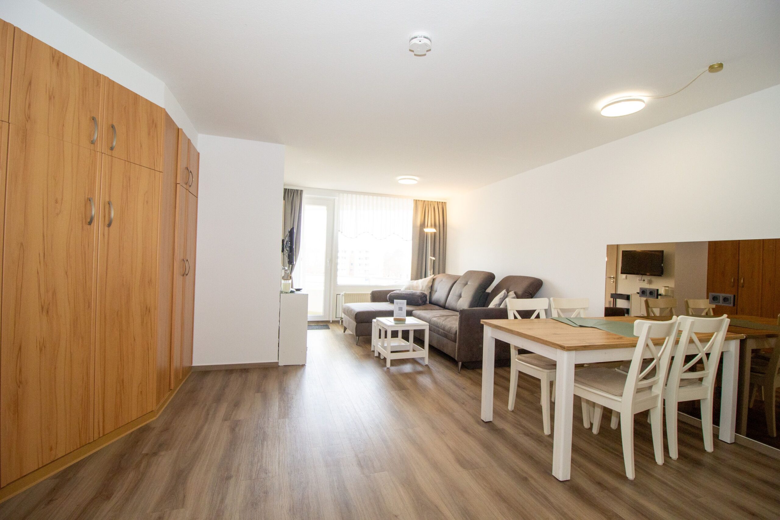 Die Ferienwohnung verfügt über einen Wohn/Schlafraum, ein kleines separates Schlafzimmer sowie ein Badezimmer mit Dusche. Die offene Küche ist modern ausgestattet und grenzt direkt an das Wohnzimmer an. Zur Ausstattung gehören ein 4-Platten-Ceranfeld, Backofen, Mikrowelle, Kühlschrank, Toaster, Wasserkocher, Kaffeemaschine sowie komplettes Geschirr und Besteck. Dies ermöglicht eine flexible Selbstversorgung während Ihres Aufenthalts. Des Weiteren steht eine Spülmaschine zur Verfügung, welche den Abwasch erleichtert.