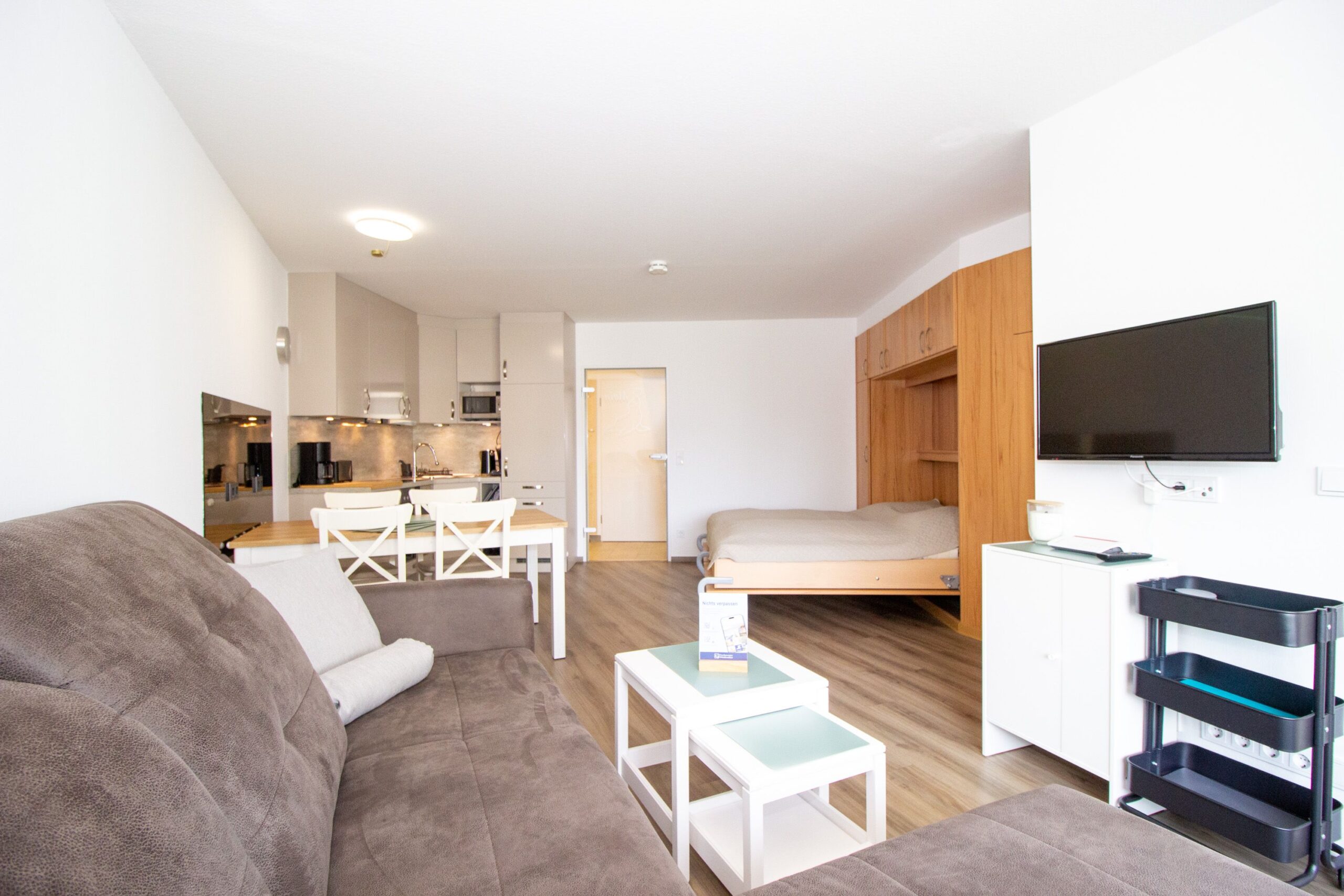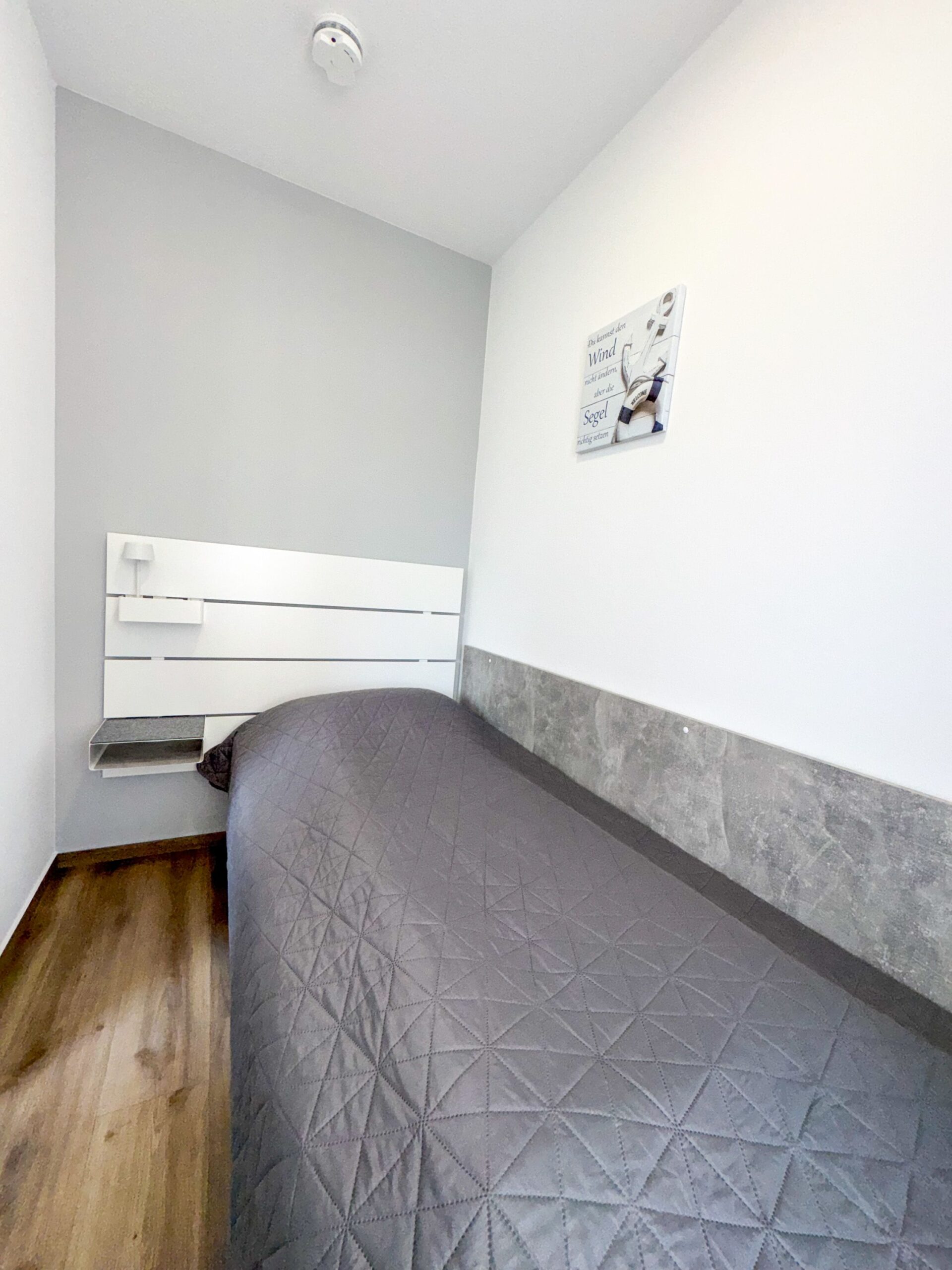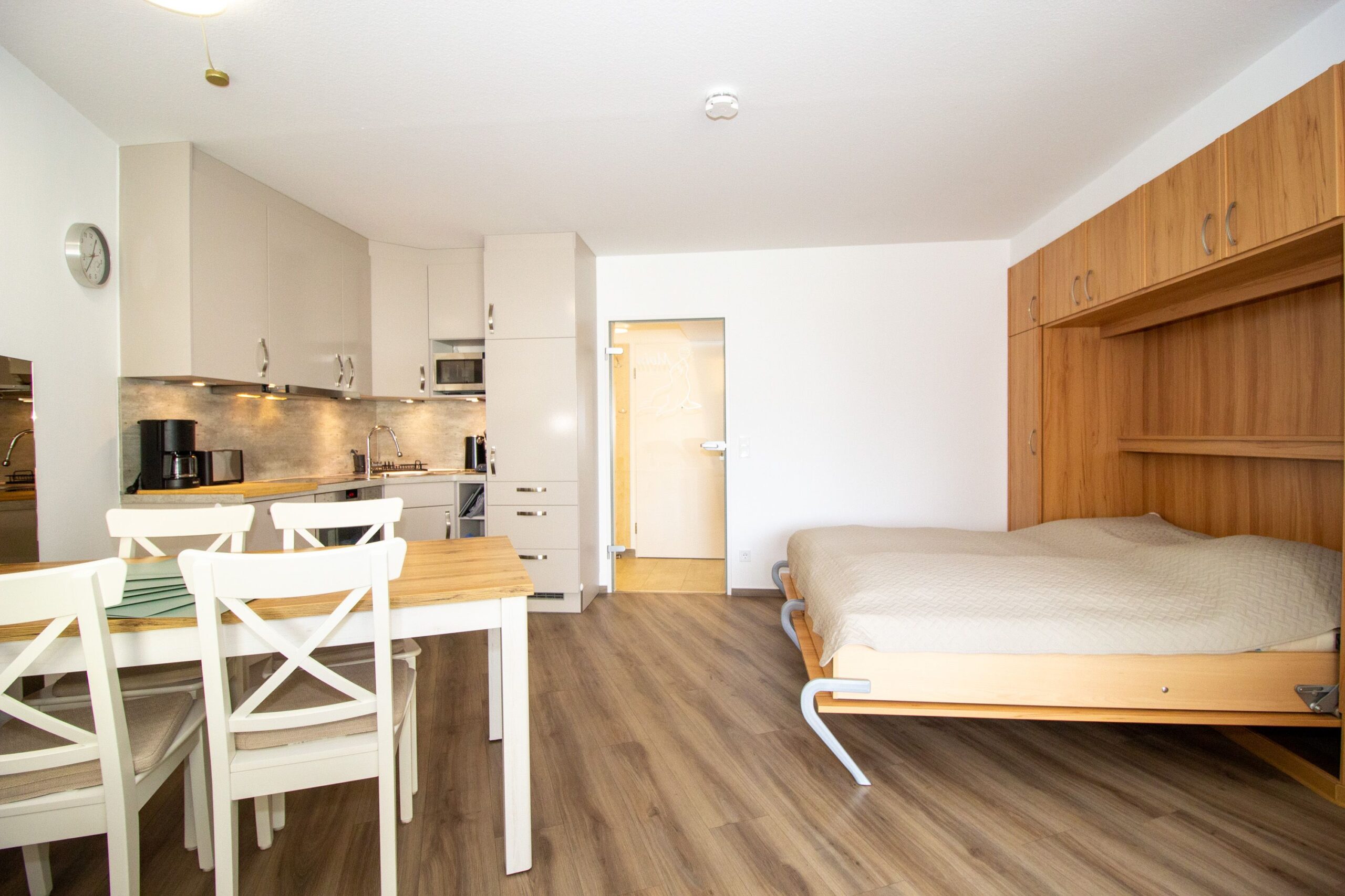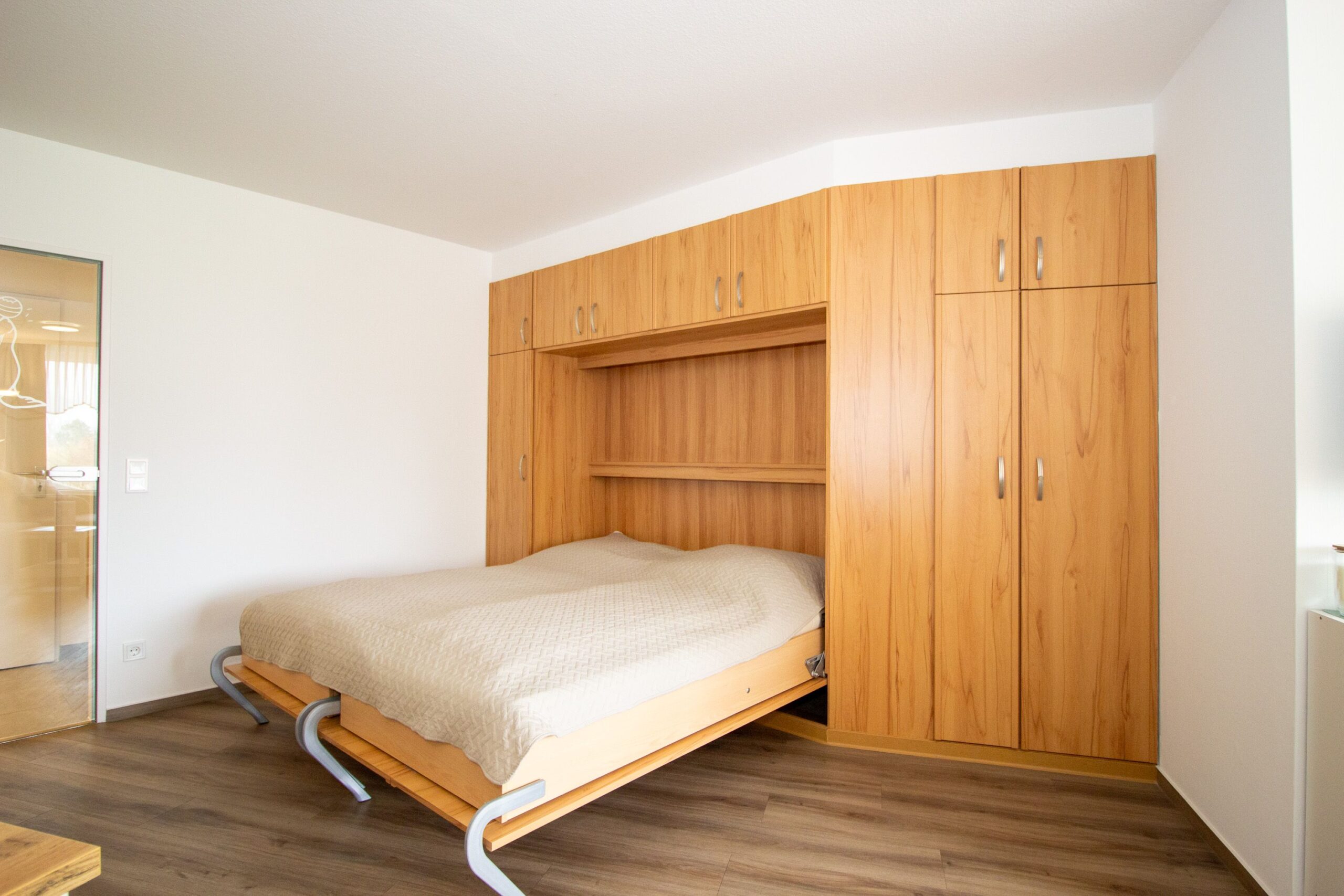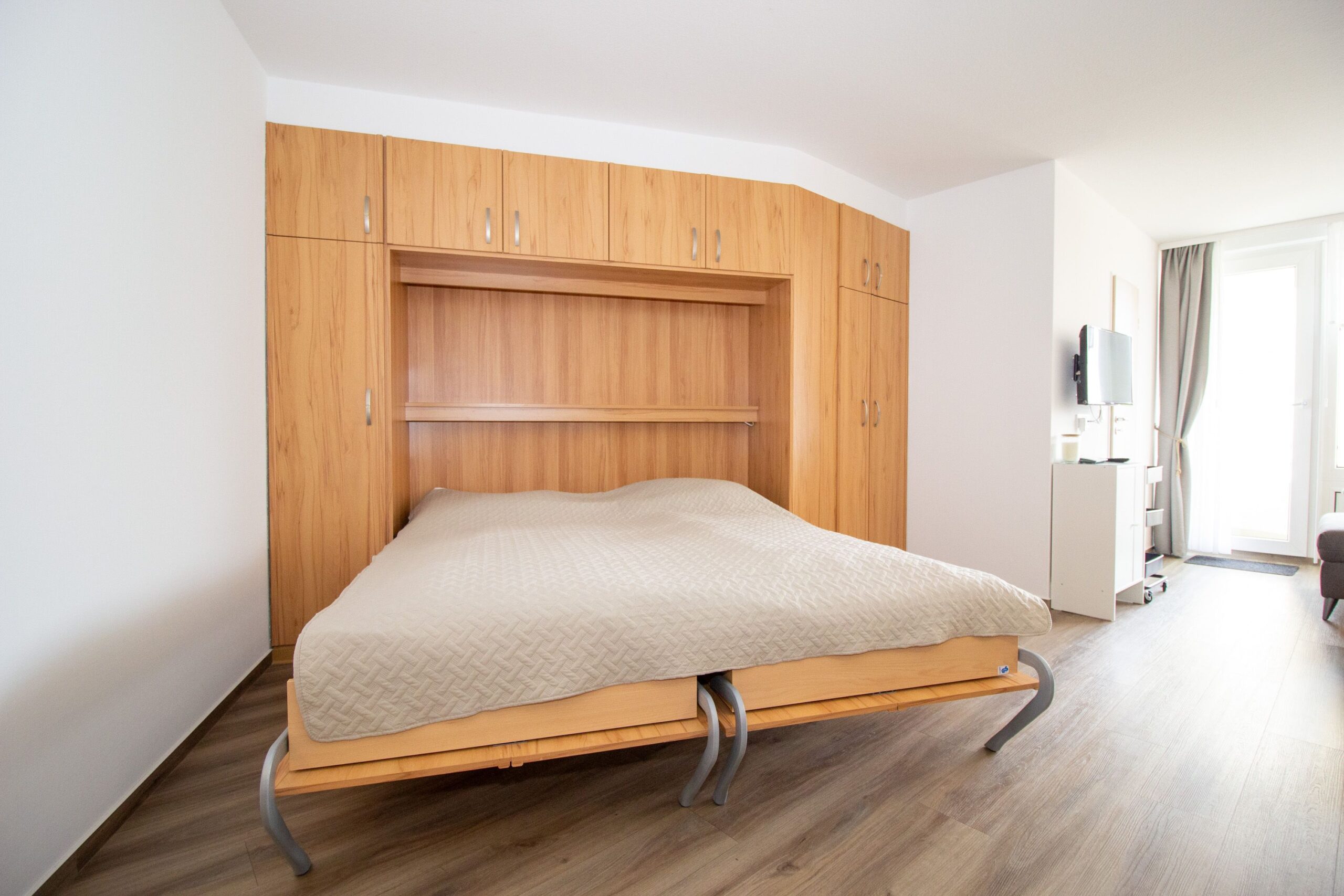 Das Wohnzimmer verwandelt sich Abends in ein gemütliches Schlafzimmer durch das platzsparende Schrankbett. Zusätzlich befindet sich im separaten Zimmer ein Einzelbett.Küche