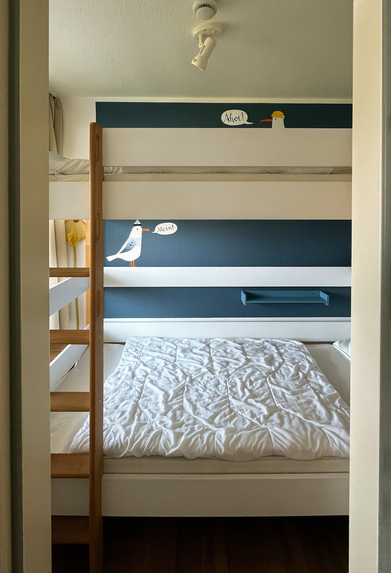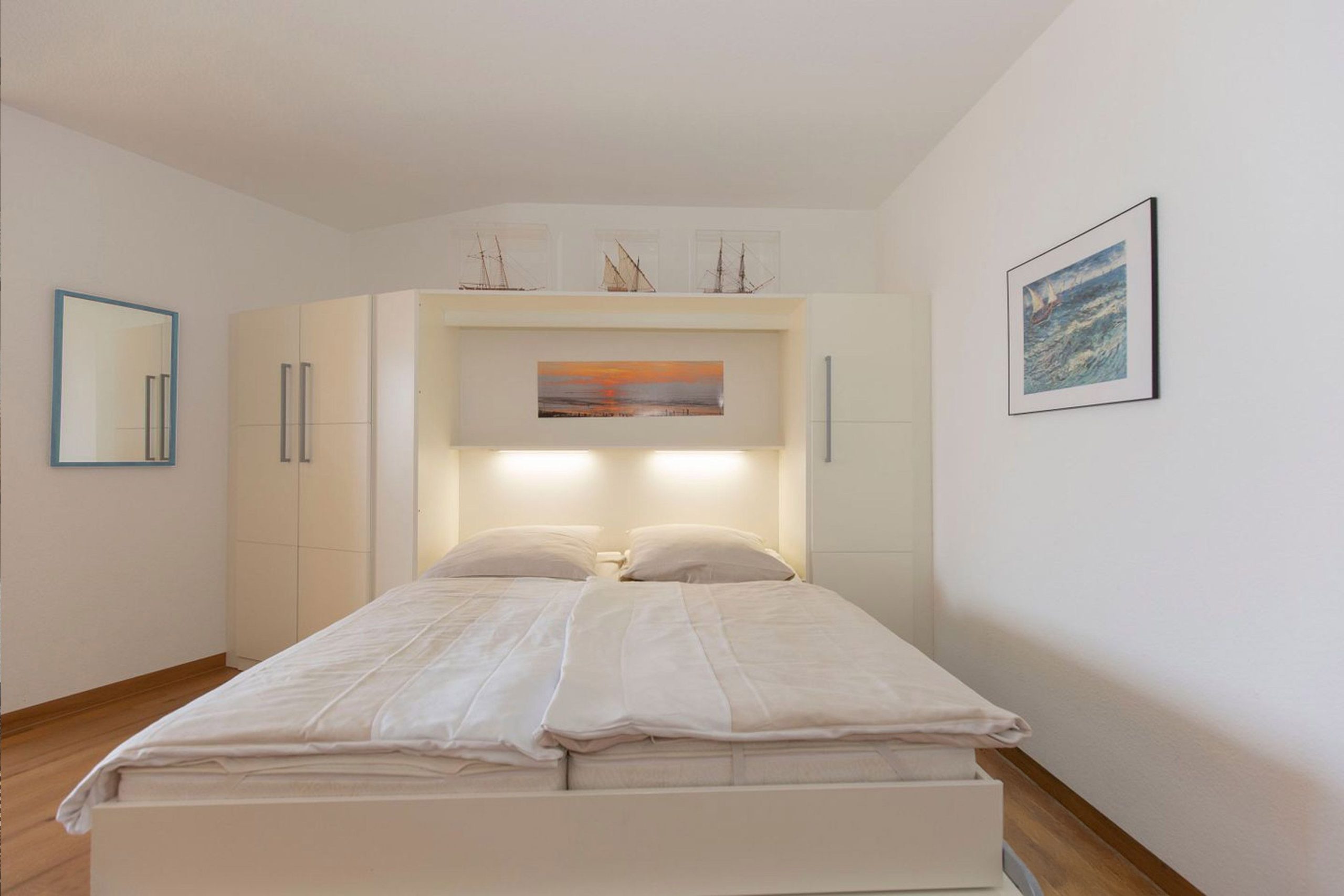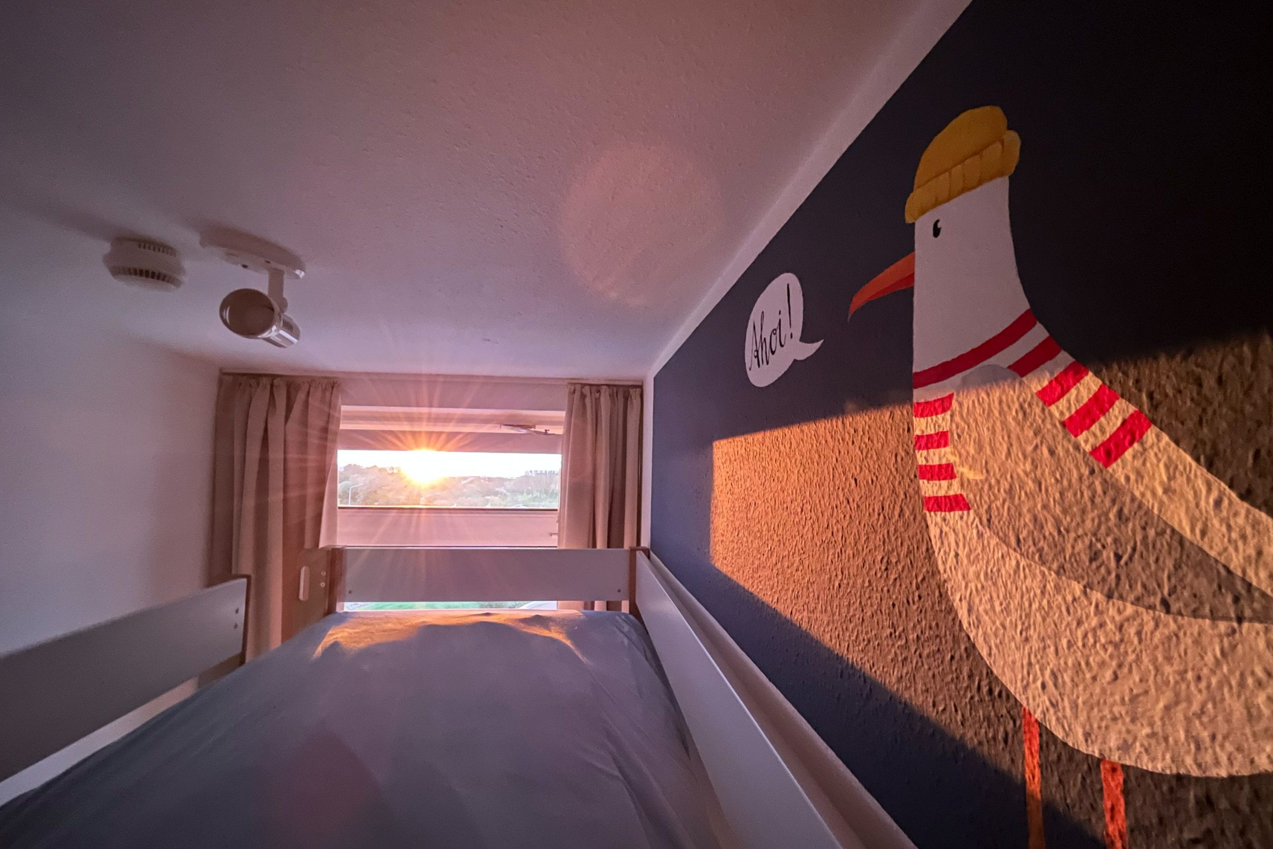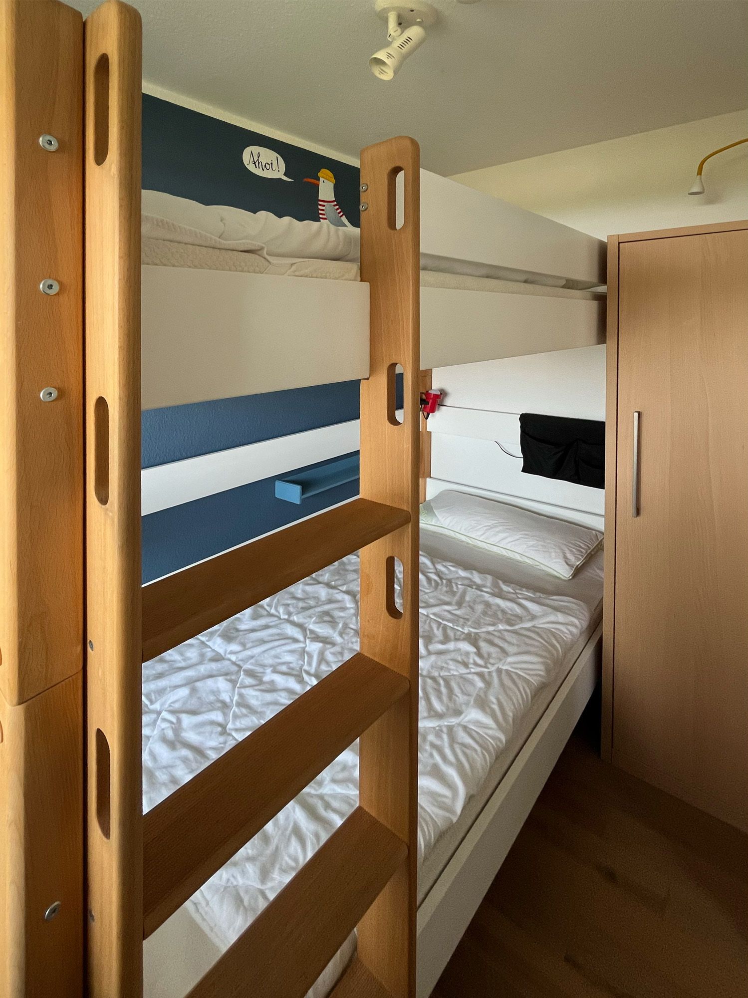 Im separaten Kinderzimmer steht ein Etagenbett für 2 kleine Gäste bereit. Im Wohnbereich der FeWo befindet sich ein Schrankbett, so dass der Wohnbereich in der Nacht zum Schlafraum wird.Küche