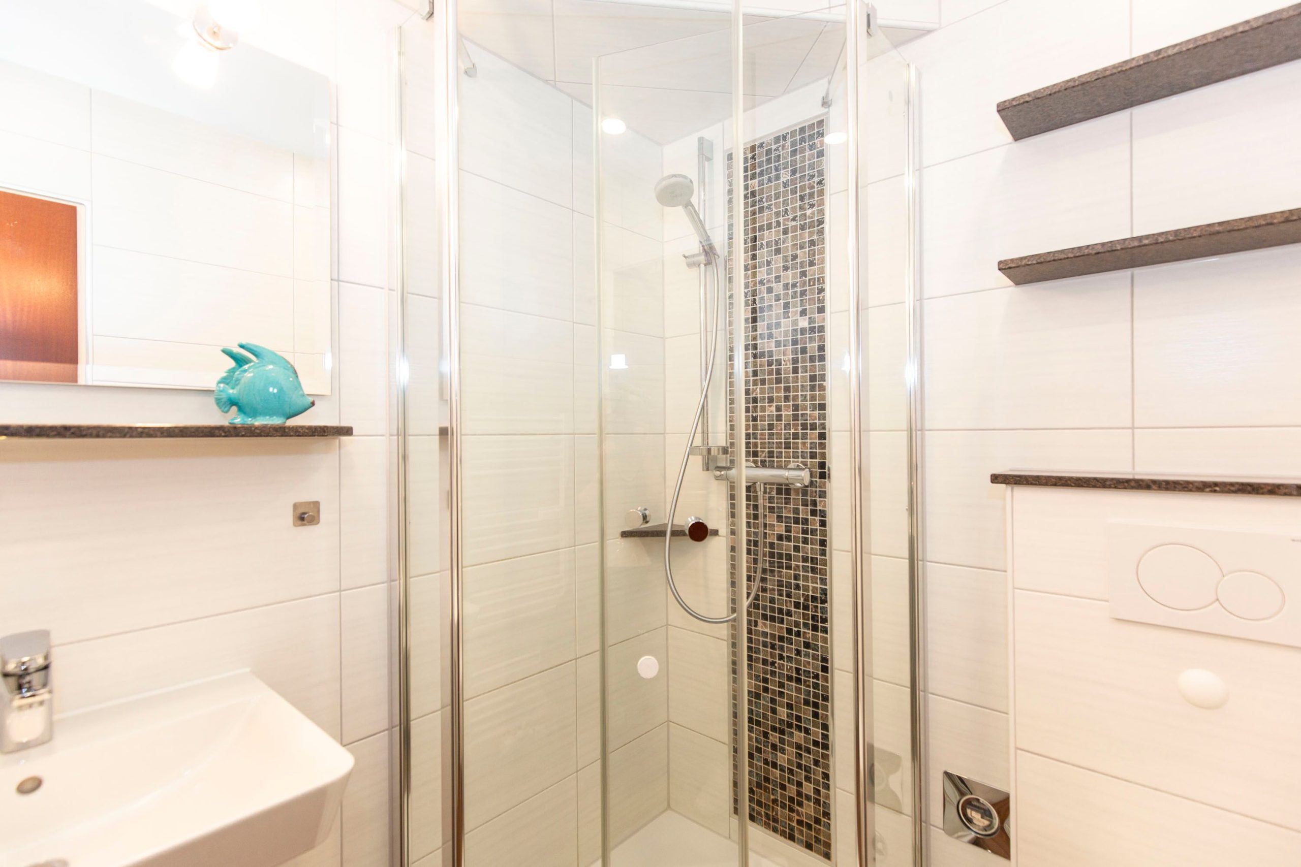 Die offene Küchenzeile ist modern und hochwertig eingerichtet. Sie verfügt über eine umfangreiche Ausstattung, wie beispielsweise einem Geschirrspüler, einer Mikrowelle und weiteren Küchenutensilien. Im angrenzenden Essbereich finden drei Urlaubsgäste an einem Holztisch Platz.Badezimmer