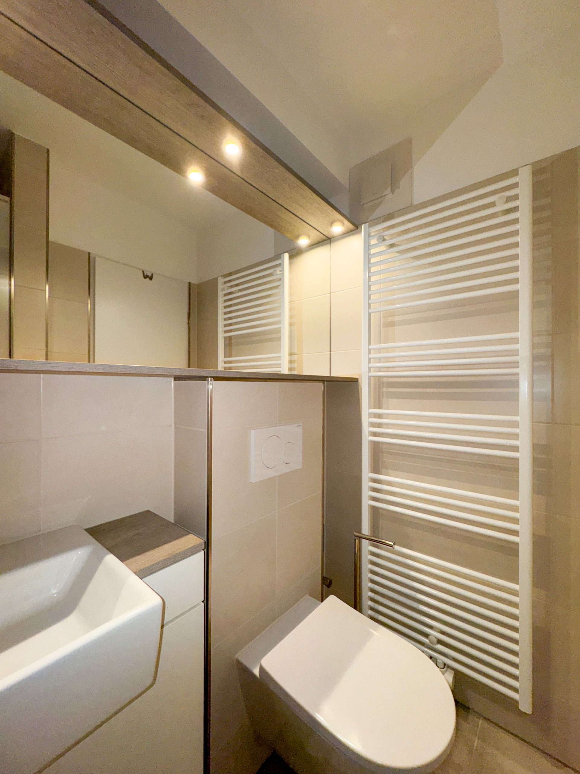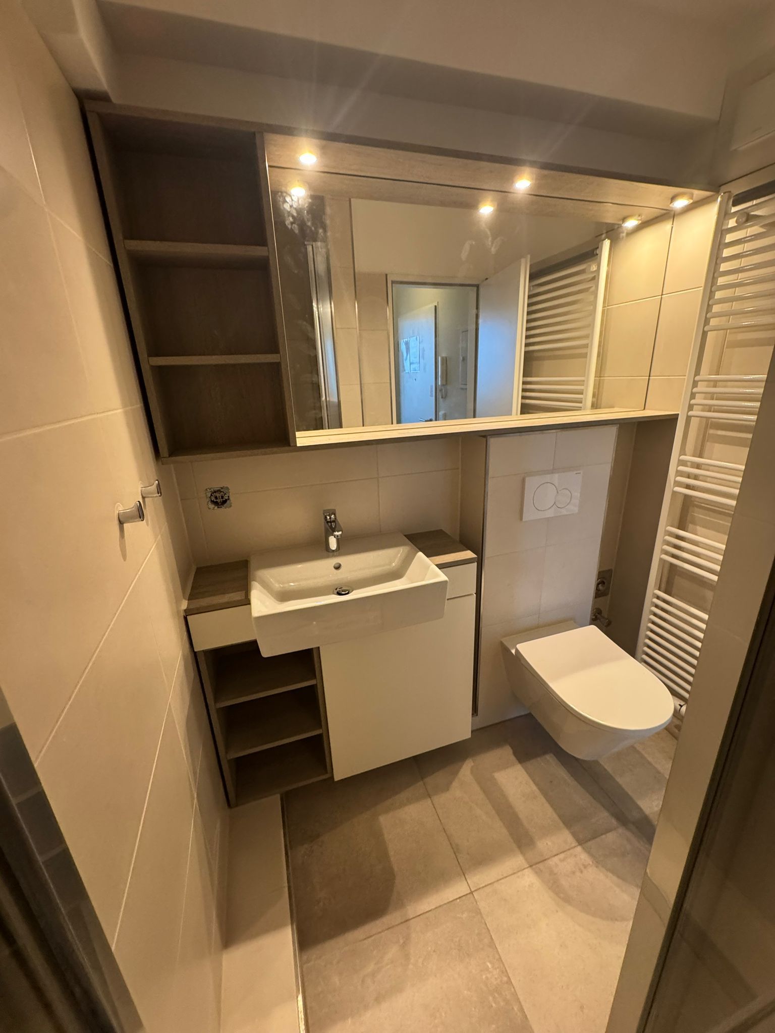 Das im Dezember 2025 vollständig renovierte Badezimmer mit großem Spiegel verfügt über Waschbecken, Dusche und WC sowie viel Stauraum für Wäsche und Handtücher.Allgemein