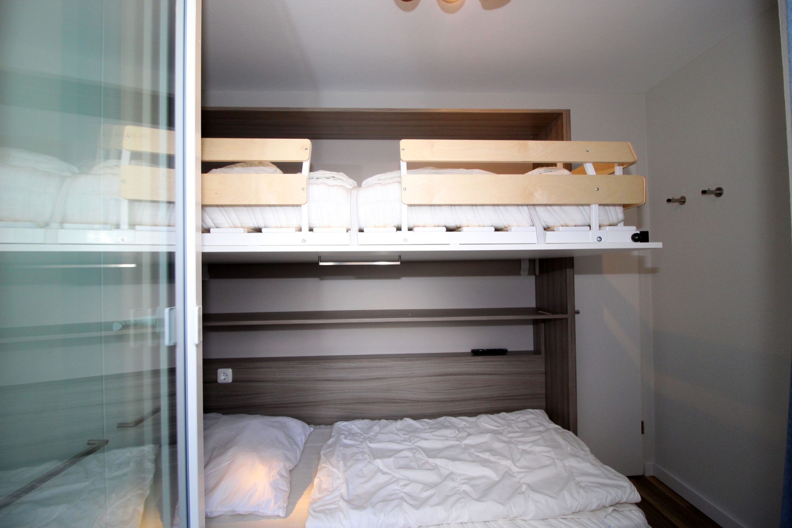 Im großzügigen Wohnbereich erwartet Sie ein Schrankbett, in dem Sie ruhige und erholsame Nächte verbringen können. Ein separates Schlafzimmer mit Einzelbett und Schiffskojenbett sowie TV eignet sich optimal für unsere kleinen Urlaubsgäste.Küche