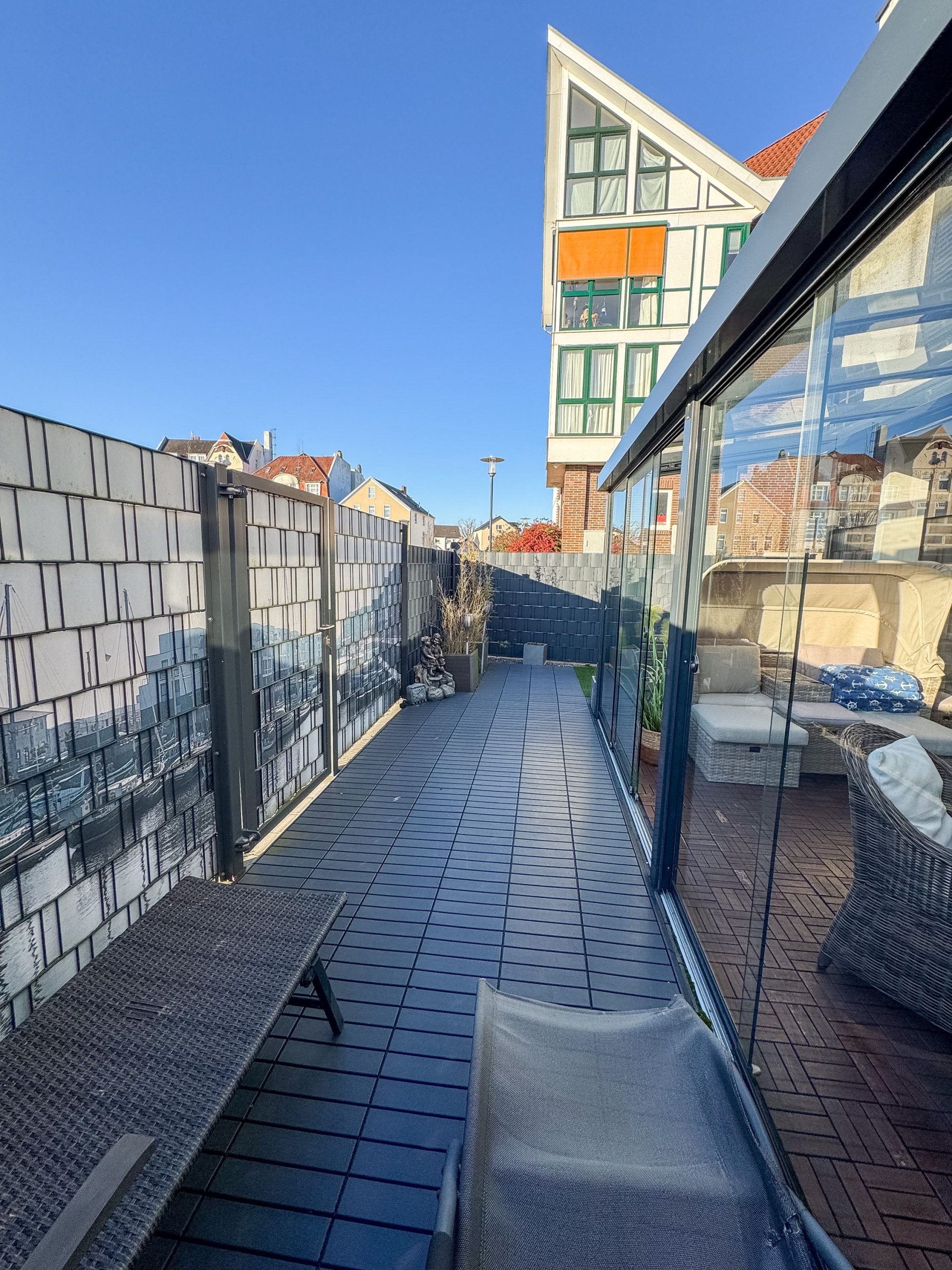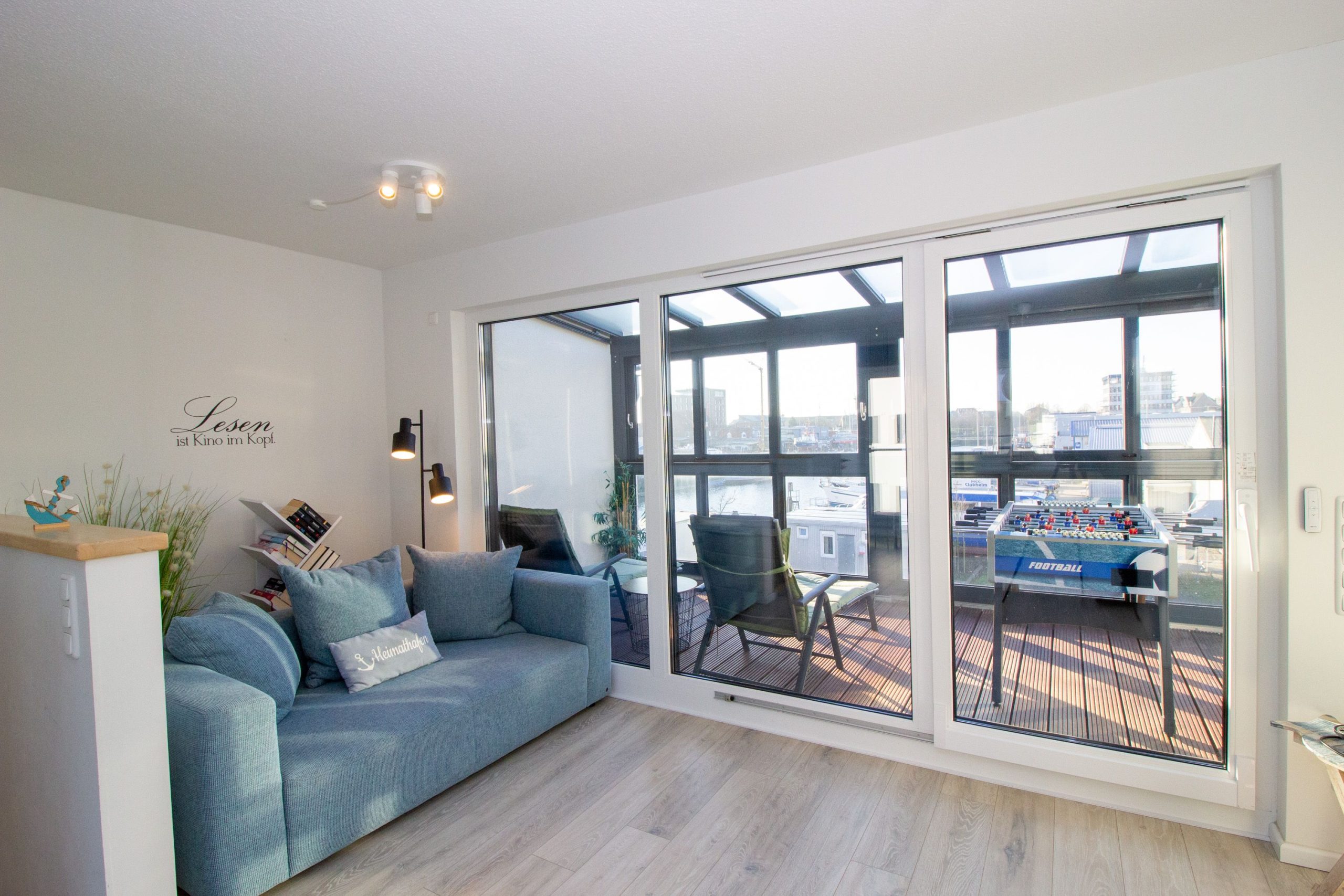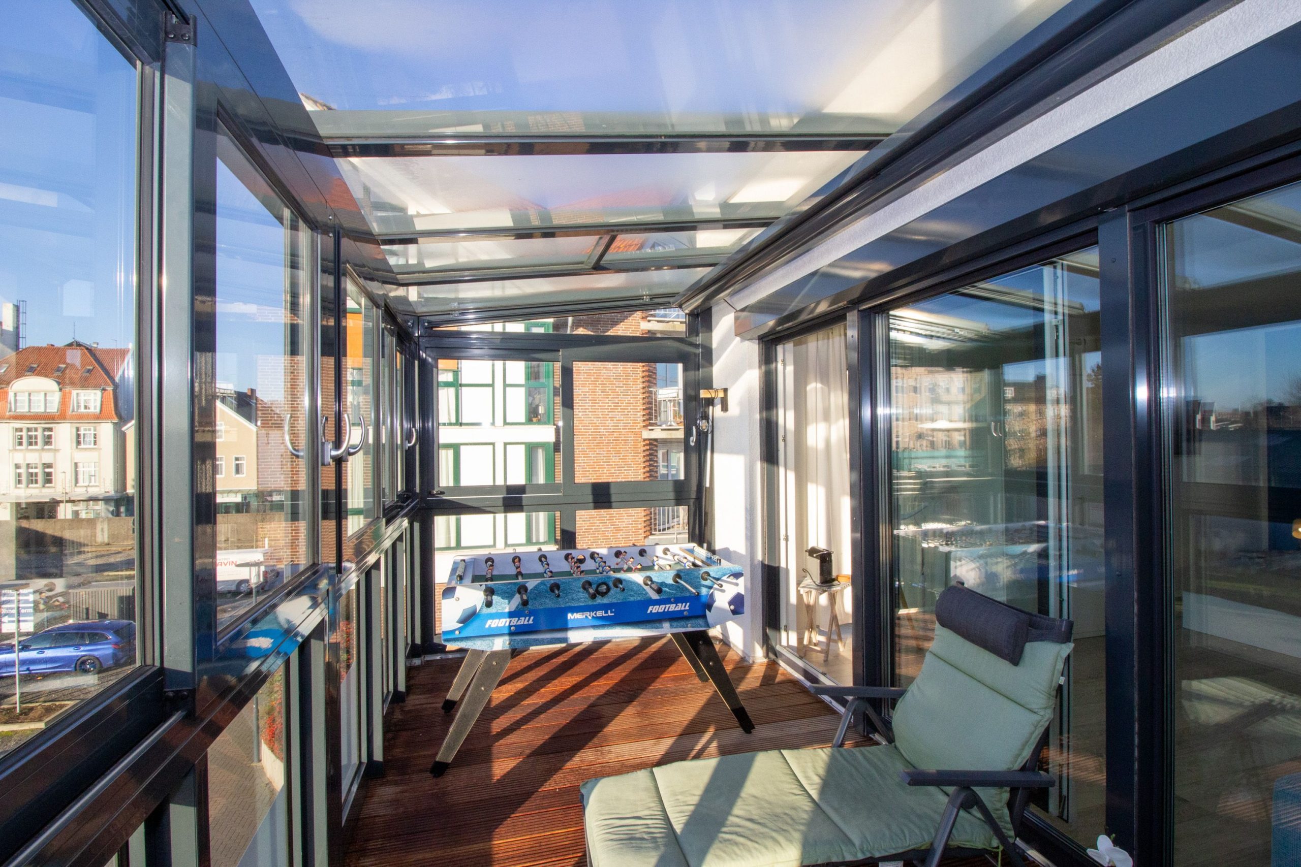 Im 2. OG befinden sich zusätzliche ein gemütlicher Nordbalkon und eine verglaste Loggia Richtung Süden, ausgestattet mit Liegen und einem Kicker zur Entspannung und Unterhaltung.
