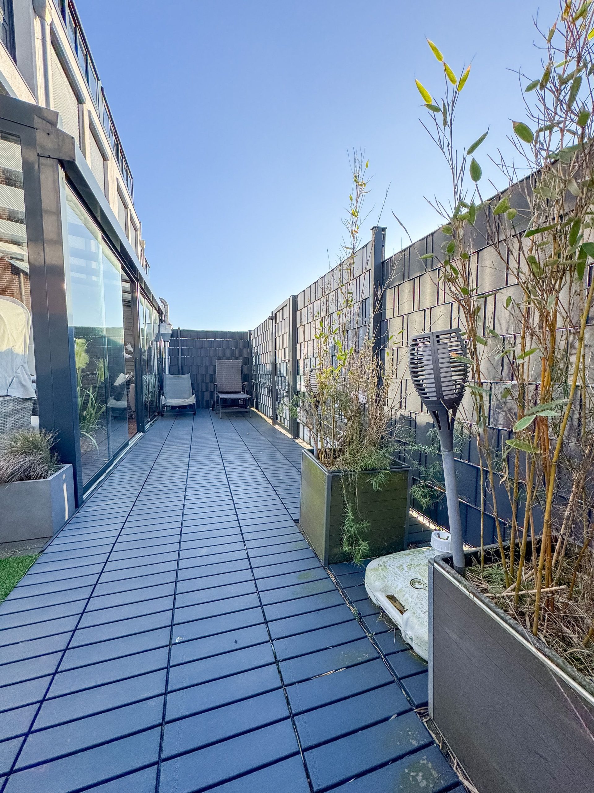 Ein besonderes Highlight ist der lichtdurchflutete Wintergarten, der das Haus zu jeder Jahreszeit mit natürlichem Licht versorgt und einen geschützten Rückzugsort bietet– ob beim Frühstück oder bei entspannten Abenden im Sonnenuntergang. Die angrenzende Terrasse läd zum Verweilen im Freien ein, wobei der Sichtschutz für die notwendige Privatsphäre sorgt.