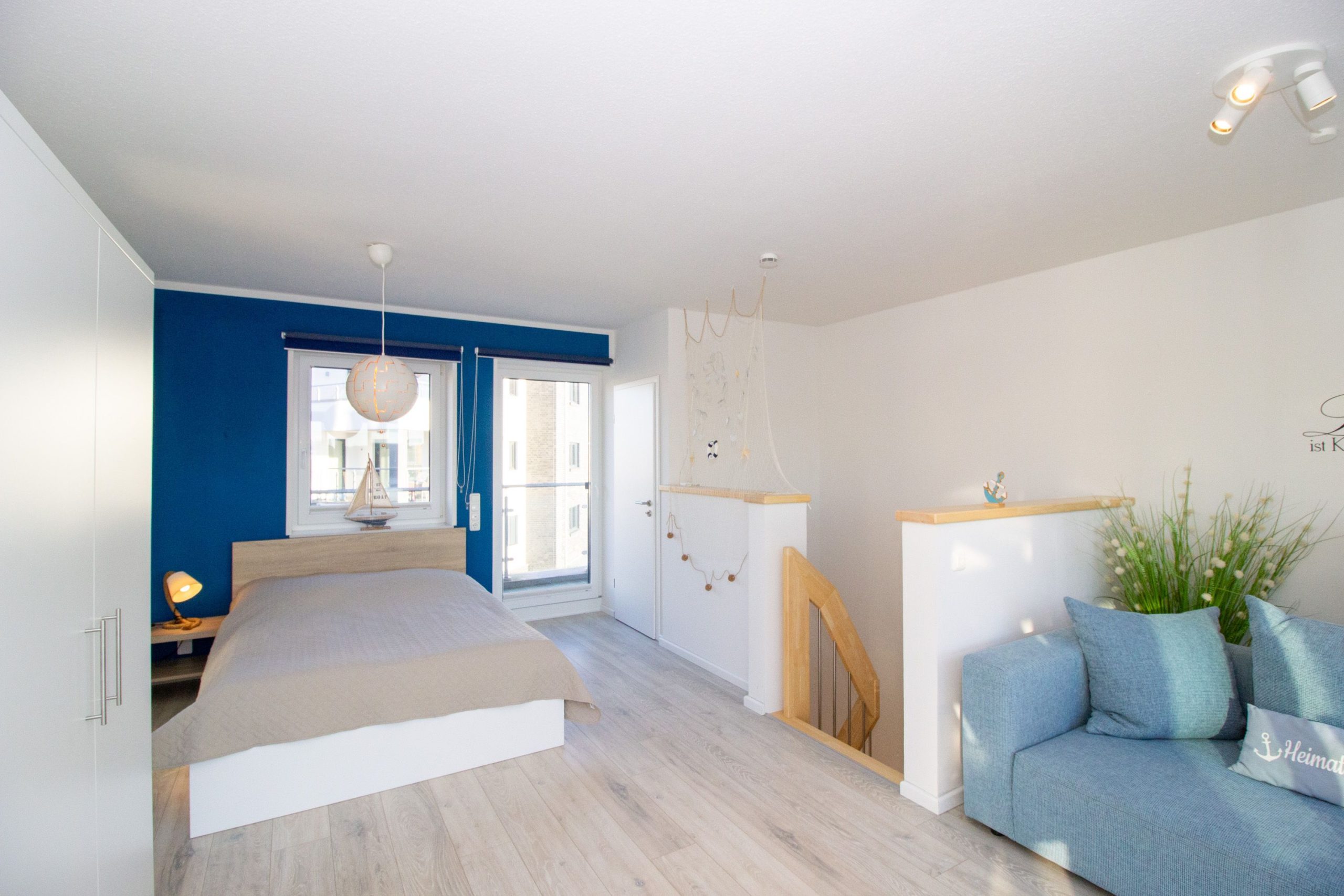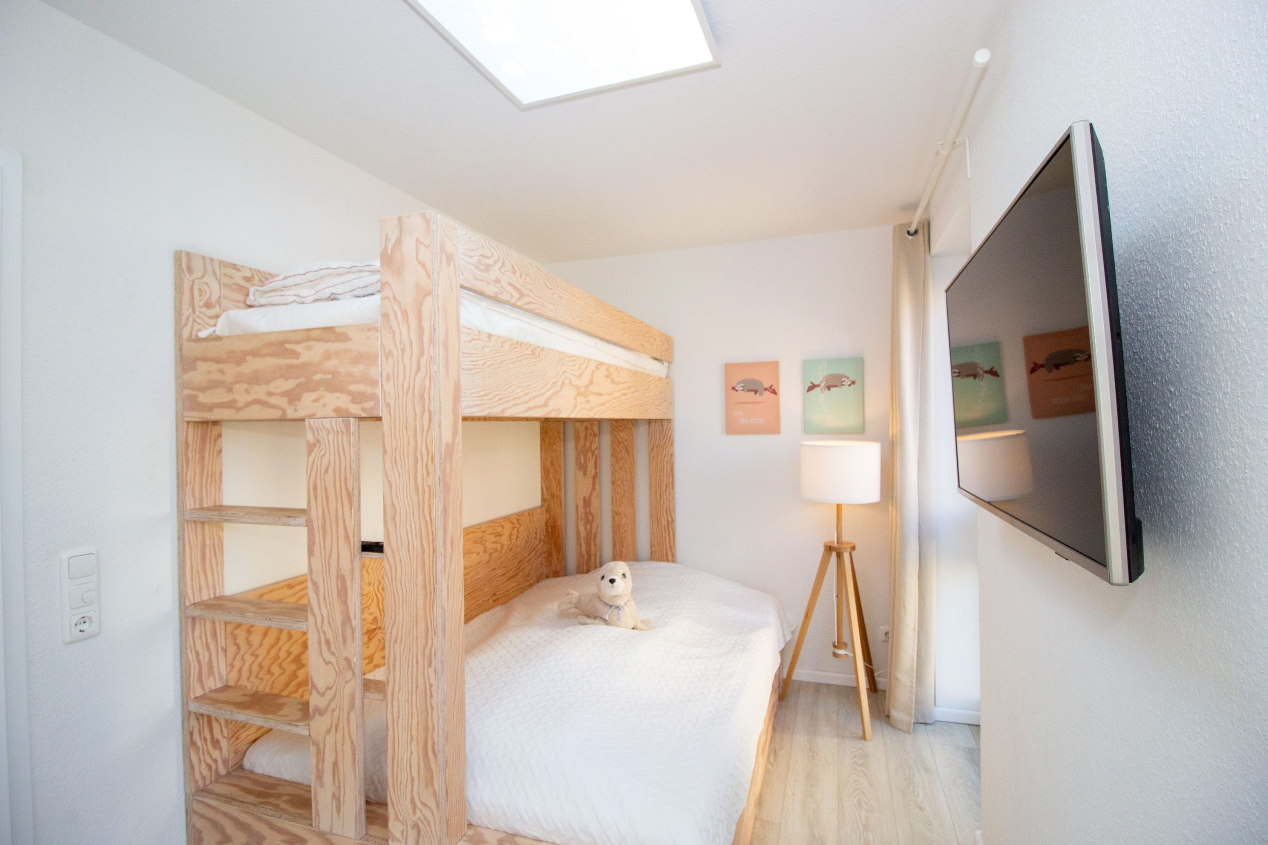 Die Ferienwohnung verfügt über insgesamt drei Schlafzimmer, zwei im 1. Obergeschoss und ein weiteres im 2. Obergeschoss. Die Schlafzimmer sind mit Kleiderschränken ausgestattet die reichlich Stauraum bieten. Achtung: Bitte beachten sie die Übergröße der 2 Matratzen im 1. OG unteres Bett im Etagenbett und 2.OG französisches Bett. Wenn Sie Ihre Bettwäsche selbst mitbringen (1,40m x 2,00m), bei alle anderen Matratzen passt die Standardgröße. Das großzügig lichtdurchflutete Schlafzimmer 1 ist mit einem Doppelbett bestückt. Schlafzimmer 2 ist mit einem Etagenbett ausgestattet, dass durch seine unterschiedlich breiten Betten besticht. Schlafzimmer 3 ist mit einem französischem Bett ausgestattet uns bietet außerdem ein Sofa zum Verweilen. Von diesem Schlafzimmer hat man außerdem Zugang zum Nordbalkon und zur verglasten Loggia die mit Liegen und einem Kicker ausgestattet ist. In allen 3 Schlafzimmer stehen Ihnen Flatscreen-TV zur medialen Unterhaltung zur Verfügung.Küche