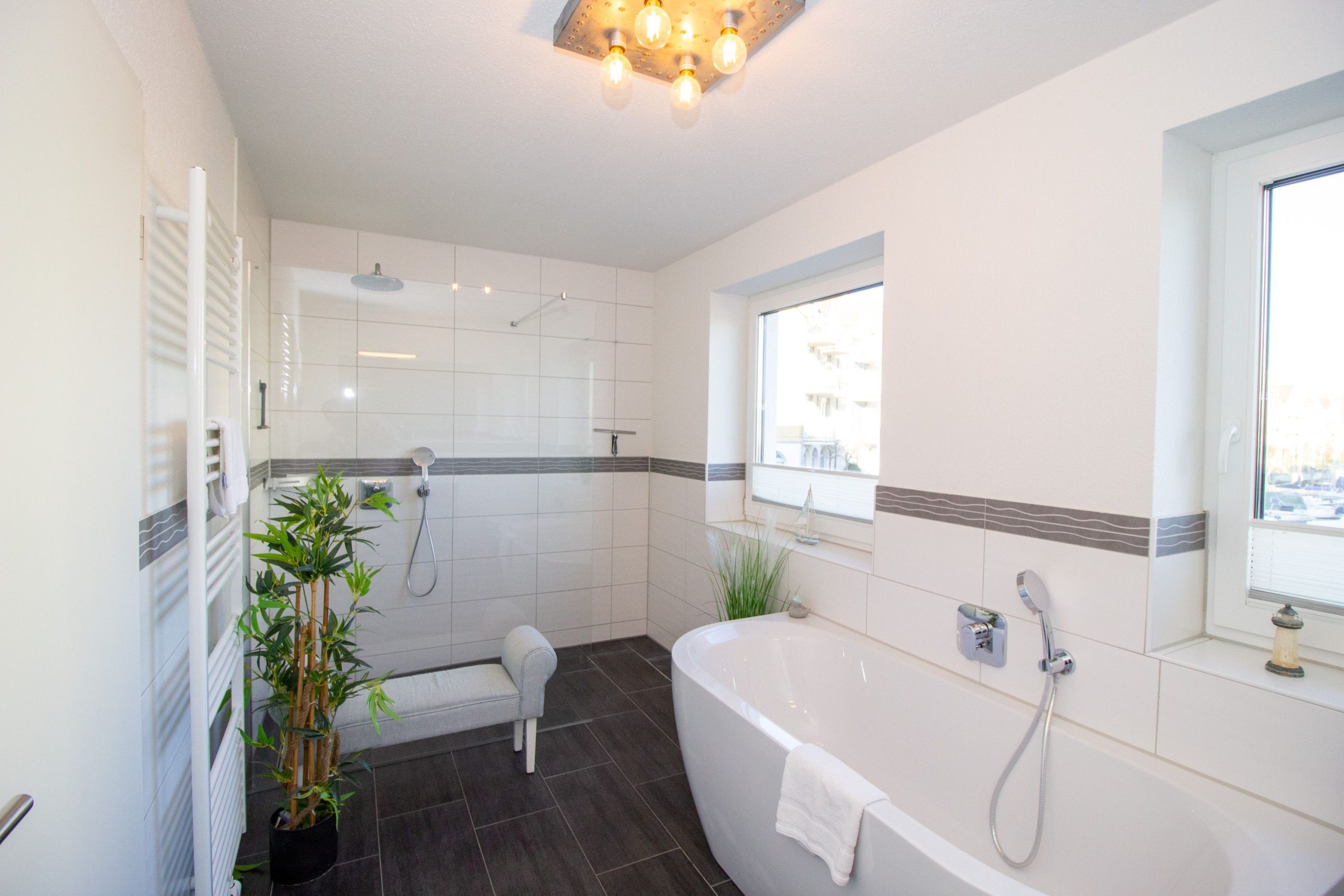 Ein voll ausgestattetes Bad mit bodengleicher Dusche, Badewanne, WC, Fenster, Waschbecken, Spiegel und Haartrockner sowie ein separates Gäste-WC – sorgen für den nötigen Komfort auch bei mehreren Gästen.Allgemein
