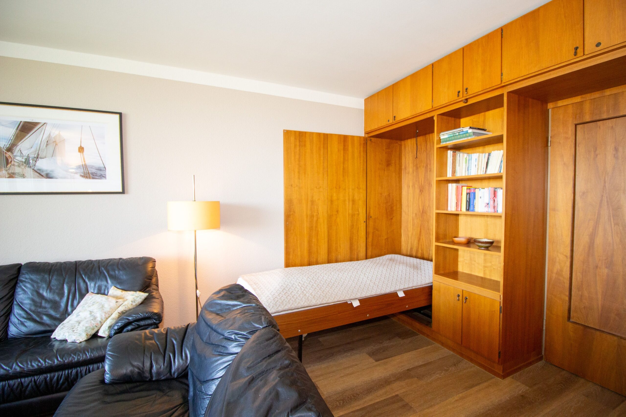 Ein separates Schlafzimmer ist mit zwei Einzelbetten bestückt. Ein Schrank bietet Stauraum für Gepäck. Die Schrankwand bietet an jeder Seite zur Wand hin ein klappbares Schrankbett. Dieser verwandelt den Wohnbereich am Abend in einen gemütlichen Schlafraum.Küche